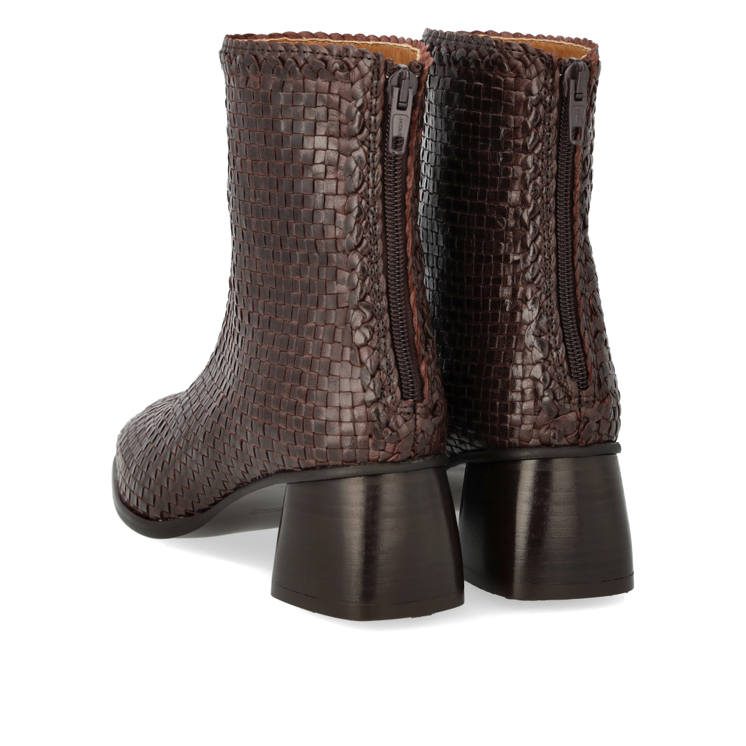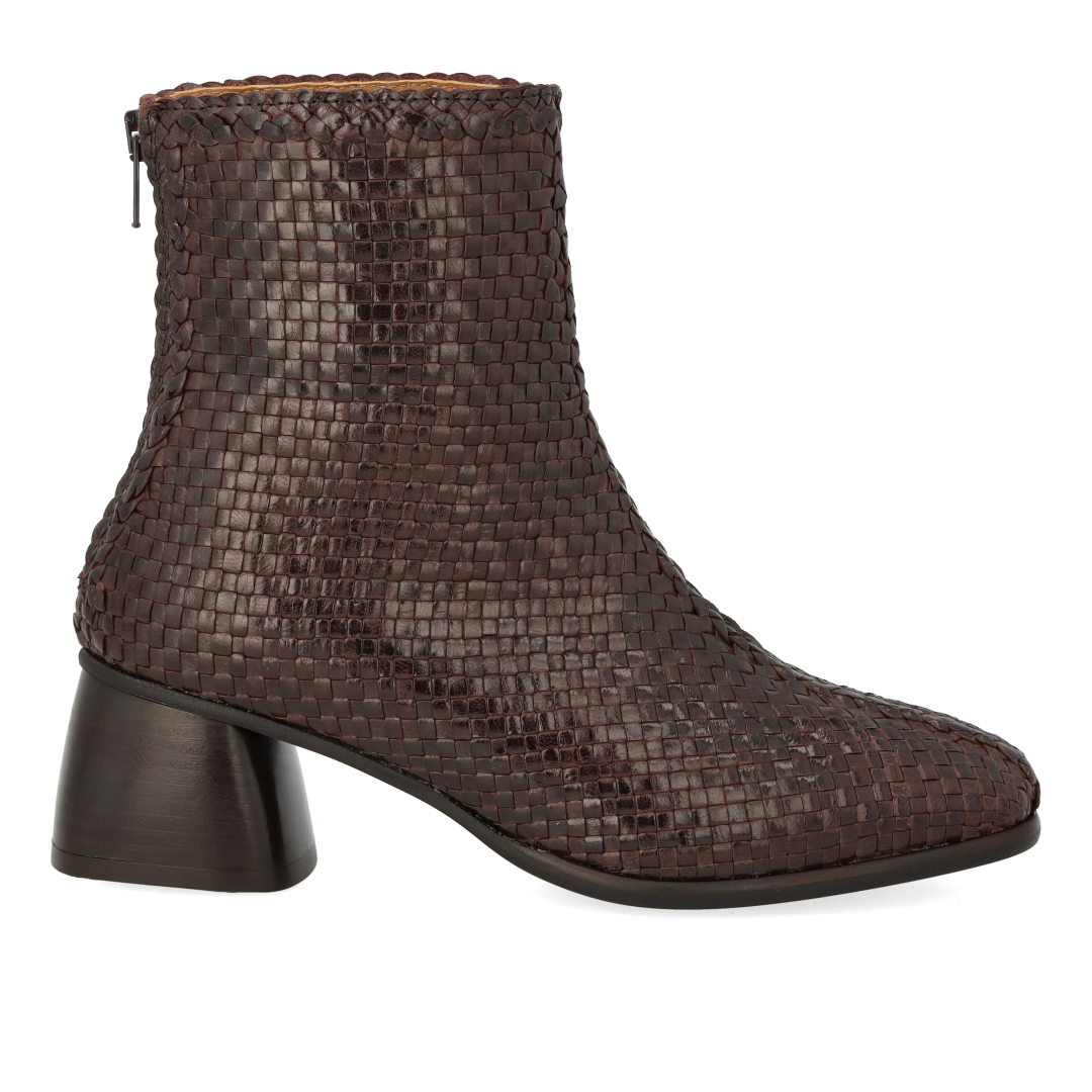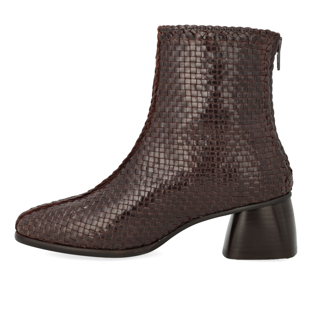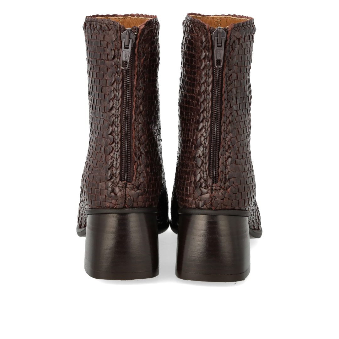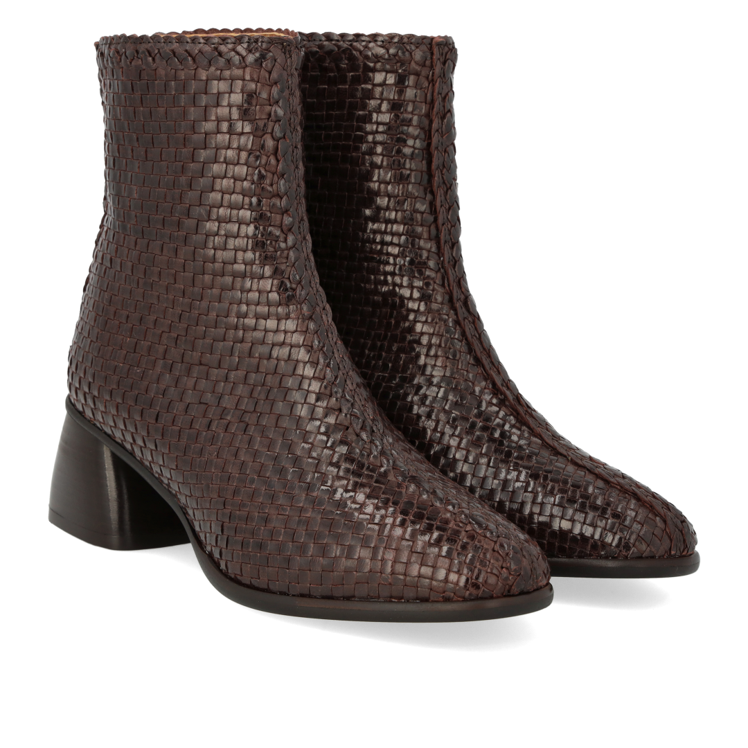 Håndflettet støvlet i læder med skulpturel mørkebrun træhæl. Støvlen har en mandelformet snude, vatteret indersål, kromfrit læderfoer, lynlåslukning i indersiden og en let tunitsål med 5 cm hæl. Dette er et naturprodukt. Den øverste del af skoen er udformet i naturligt vegetabilsk garvet læder og er håndvævet i Indien, hvilket gør hvert eneste par unikt. Farve og mønster kan variere. Behandl dem med omhu. Udformet i naturligt og åndbart skind. Designet i Danmark og håndlavet med kærlighed i Portugal.