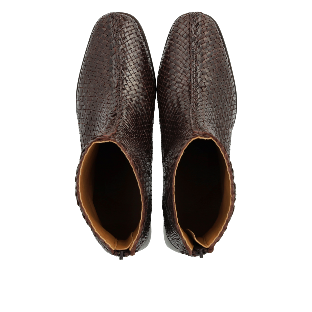 Håndflettet læderstøvlet med skulpturel blokhæl Håndflettet læderstøvlet med skulpturel blokhæl
