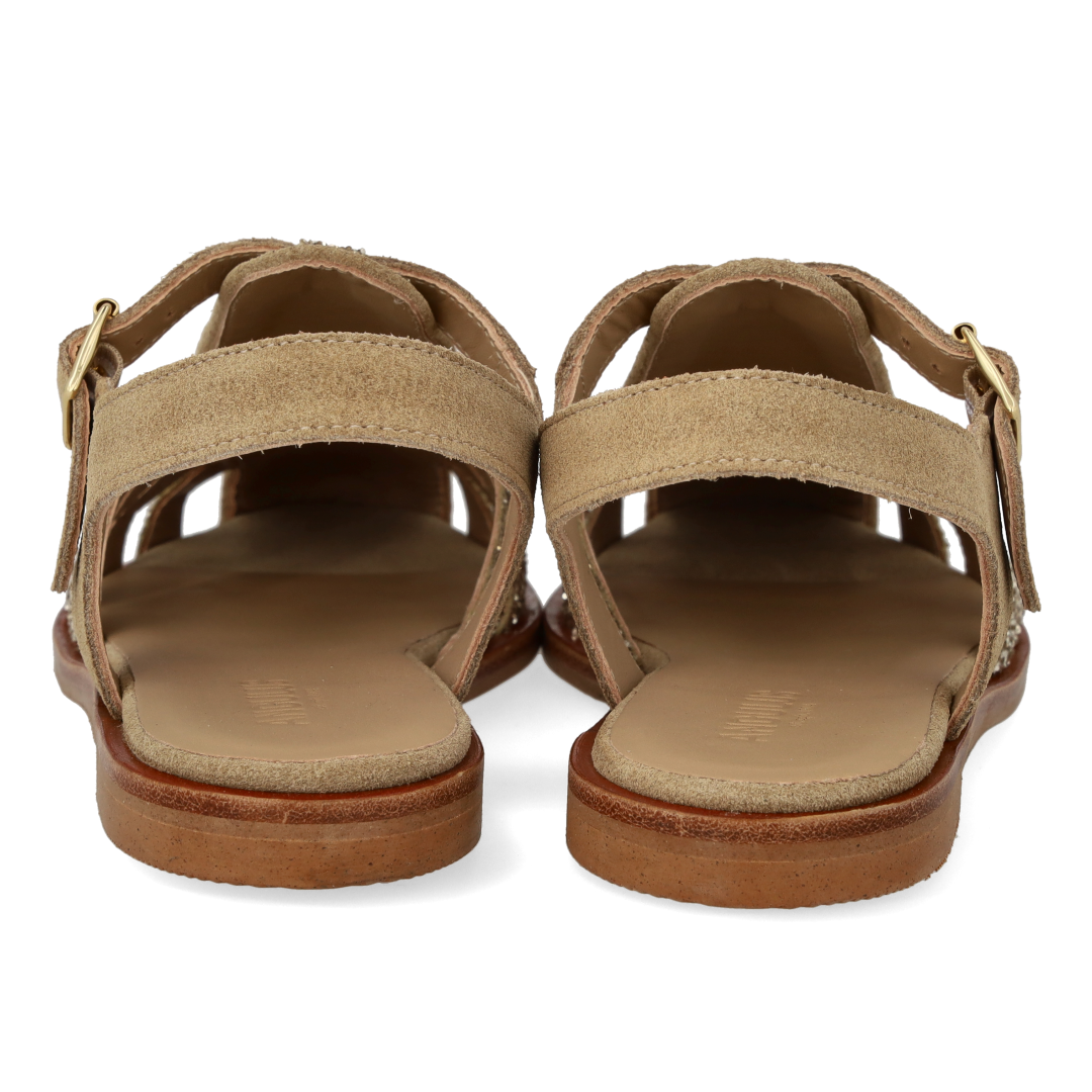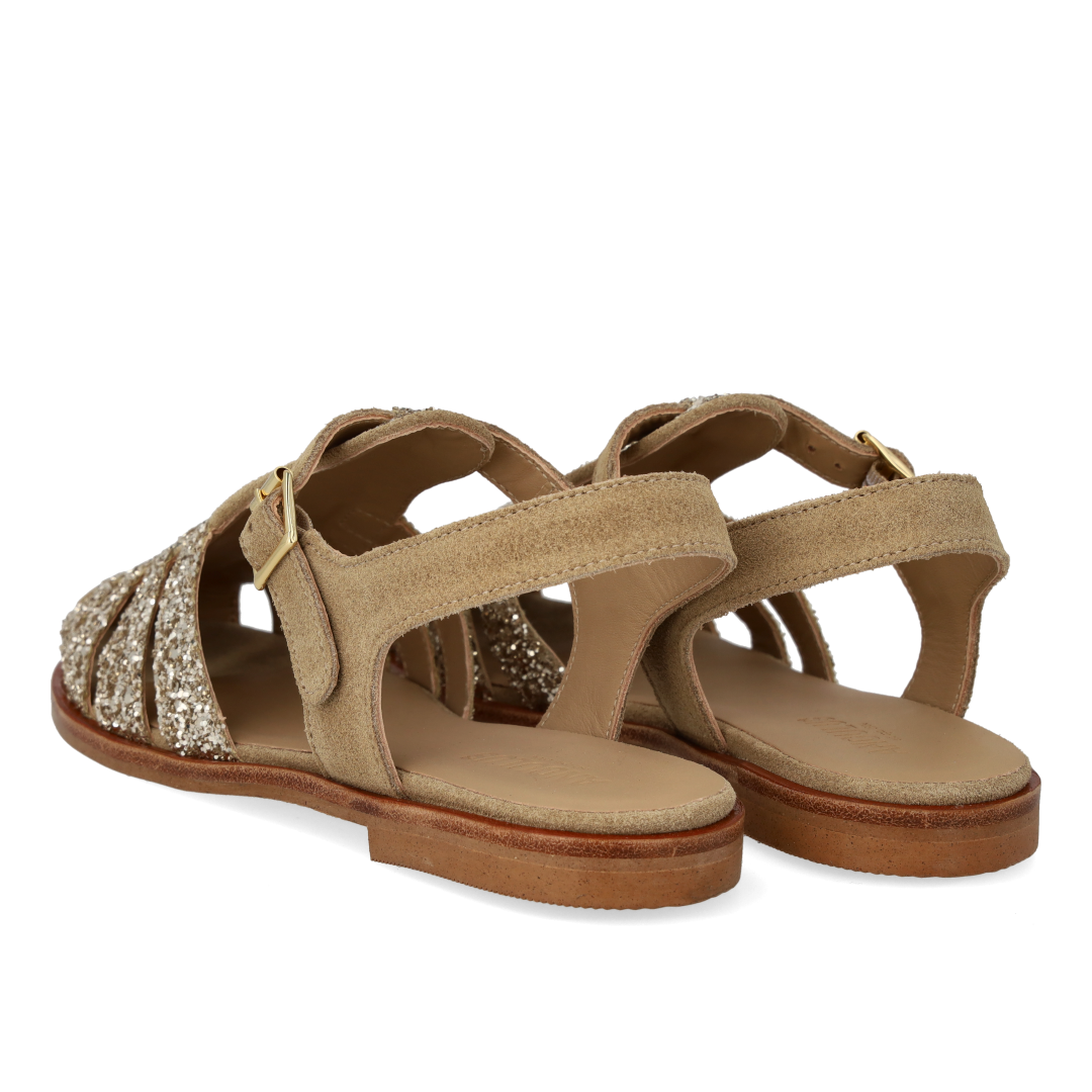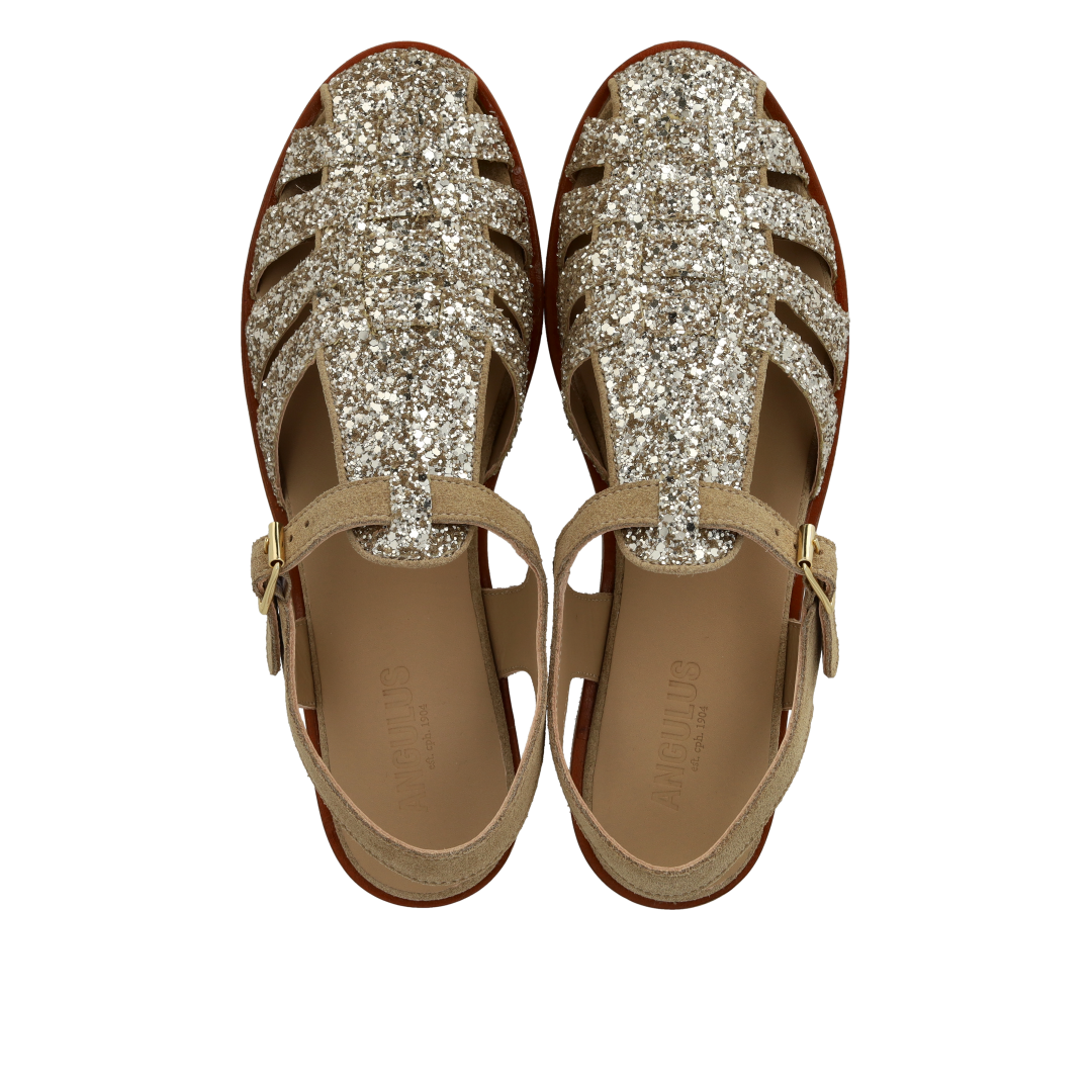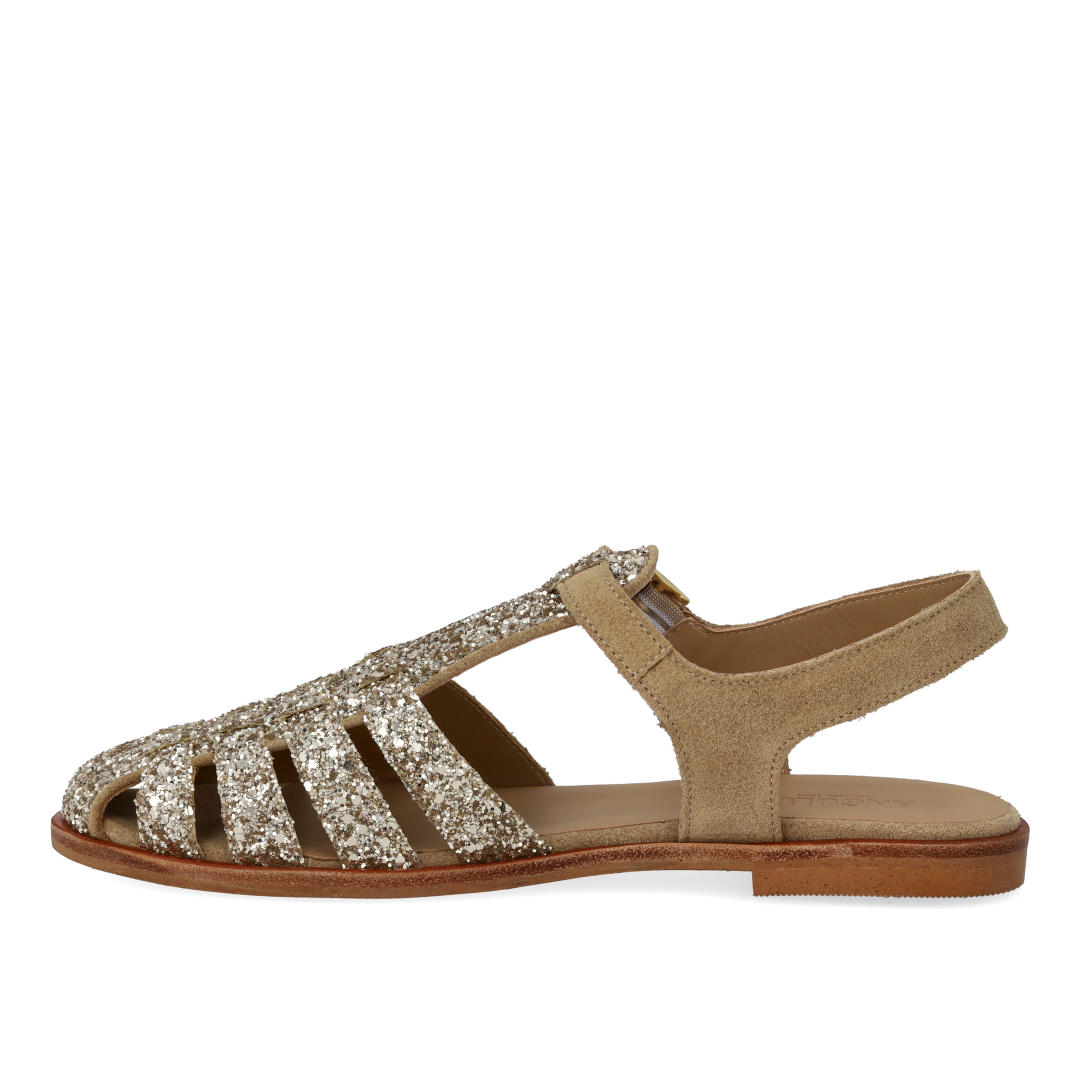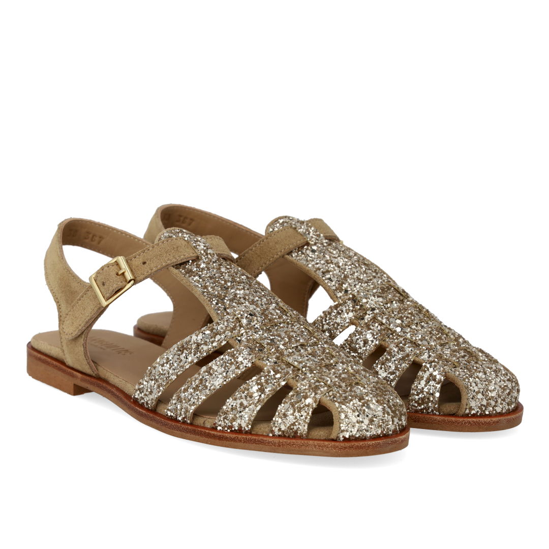 Klassisk Fisherman’s sandal med funklende glitter. Sandalen har en rundet snude, åben hæl, justerbar lukning med guldspænde, polstret læder indersål og en let tunitsål. Udformet i naturligt og åndbart skind. Skoen skal ikke have imprægnering eller andet pleje, da det kan gøre glitteret mat. Designet i Danmark og håndlavet med kærlighed i Portugal.