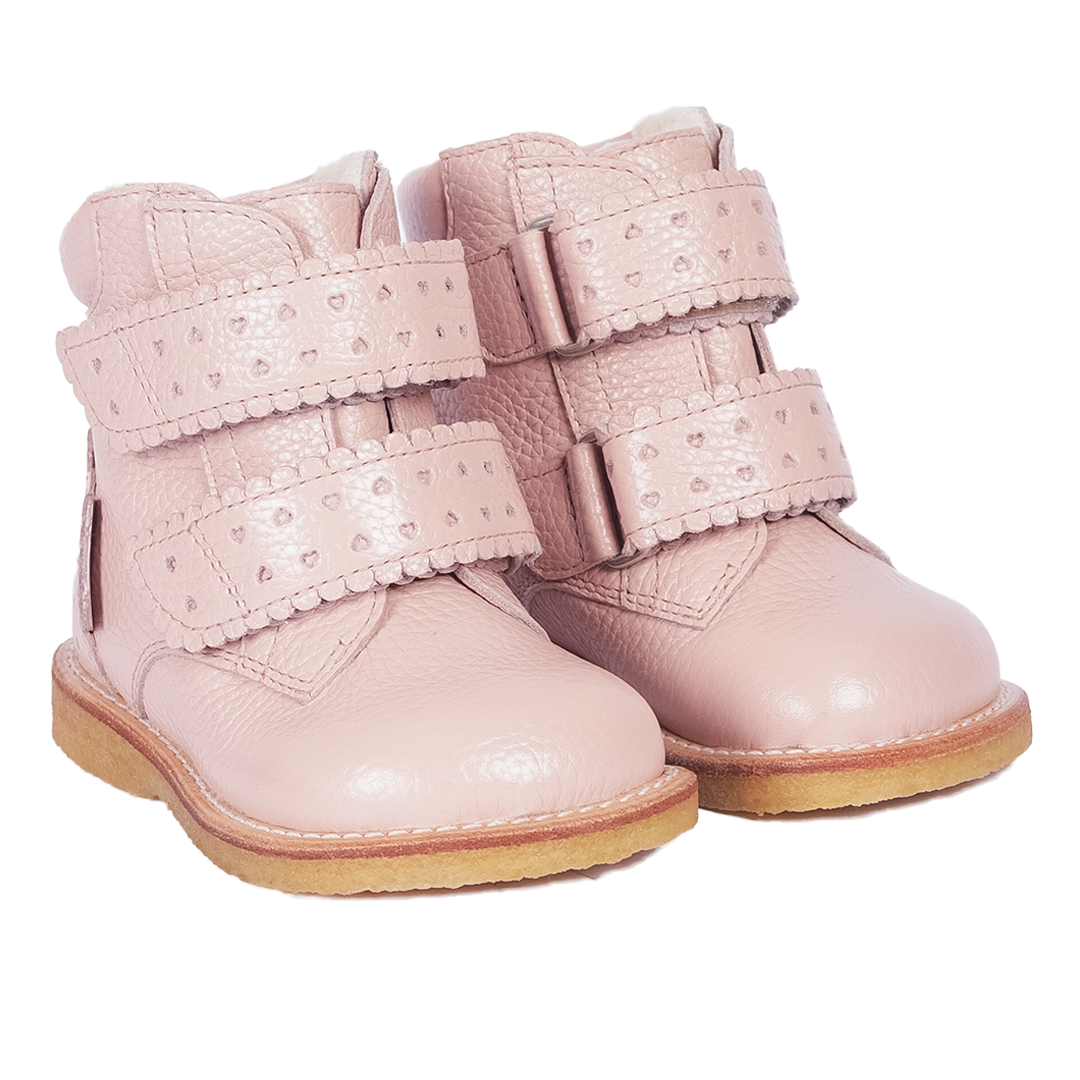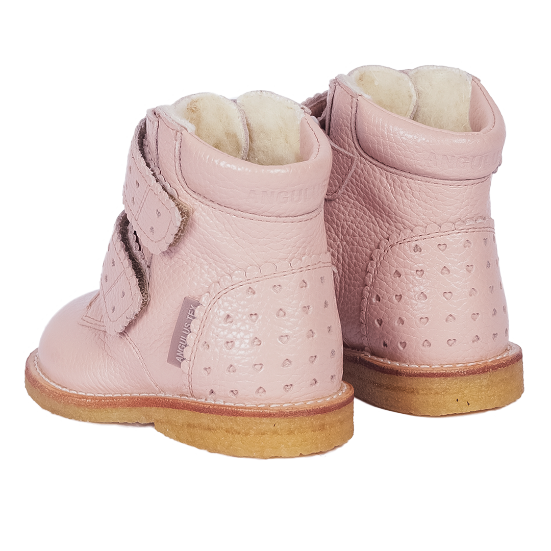 Begynder TEX-vinterstøvle i læder med hjerte hulmønster og dekorative bølgekanter, der er designet til at holde små fødder varme og tørre, uanset vejret. Støvlen har justerbare velcroremme, uldfoer, præget logo, let, blød og fleksibel rågummisål i fornybar naturgummi samt en fast hælkappe med polstret krave for ekstra komfort og støtte. Udformet i naturligt og åndbart skind med PFAS-fri TEX-membran. Designet i Danmark og håndlavet med kærlighed i Portugal. Mål altid barnets fod inden du køber, så du får købt den rigtige størrelse. Vi anbefaler et voksetillæg på 1-1,2 cm.