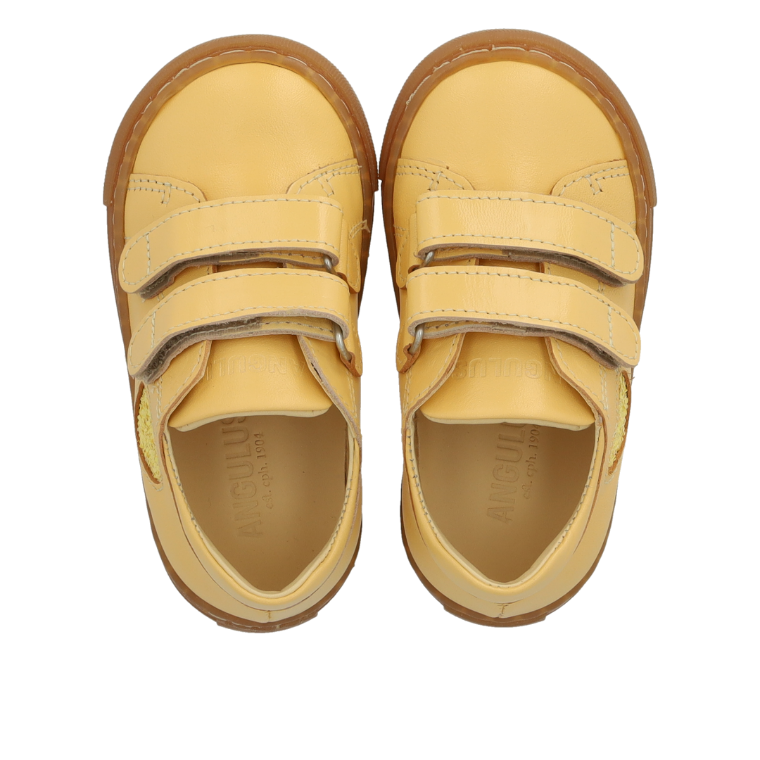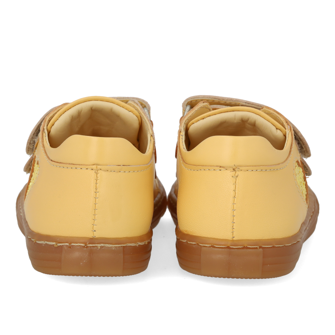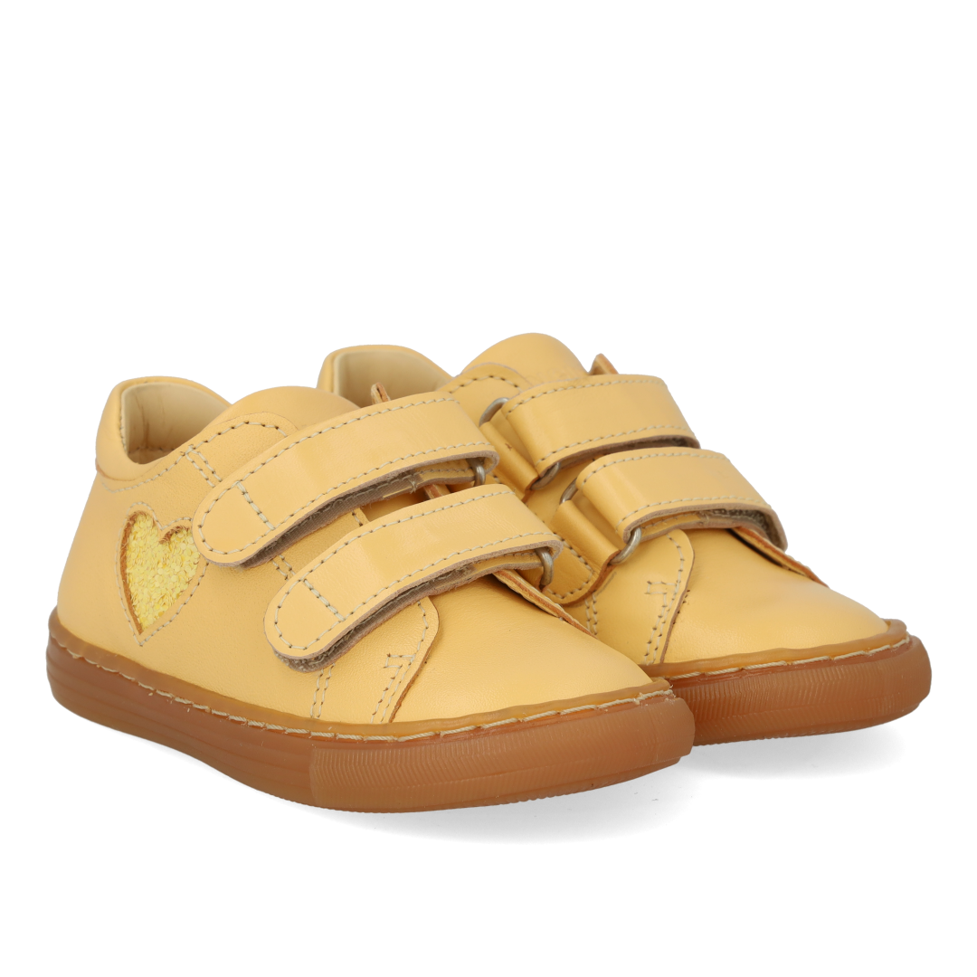 Klassisk begynder sneaker i læder med funklende glitterhjerte. Skoen har justerbare velcroremme, præget logo på tungen, fast hælkappe med polstret krave for ekstra komfort, stabilitet og støtte, vatteret indersål, kromfrit læderfoer og en let, blød og fleksibel gummisål. Udformet i naturligt og åndbart skind. Designet i Danmark og håndlavet med kærlighed i Portugal. Mål altid barnets fod inden du køber, så du får købt den rigtige størrelse. Vi anbefaler et voksetillæg på 1 cm.