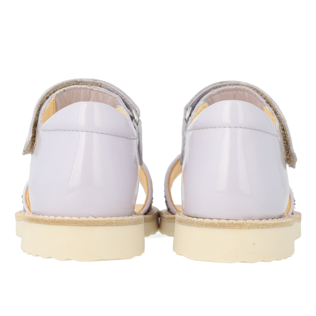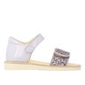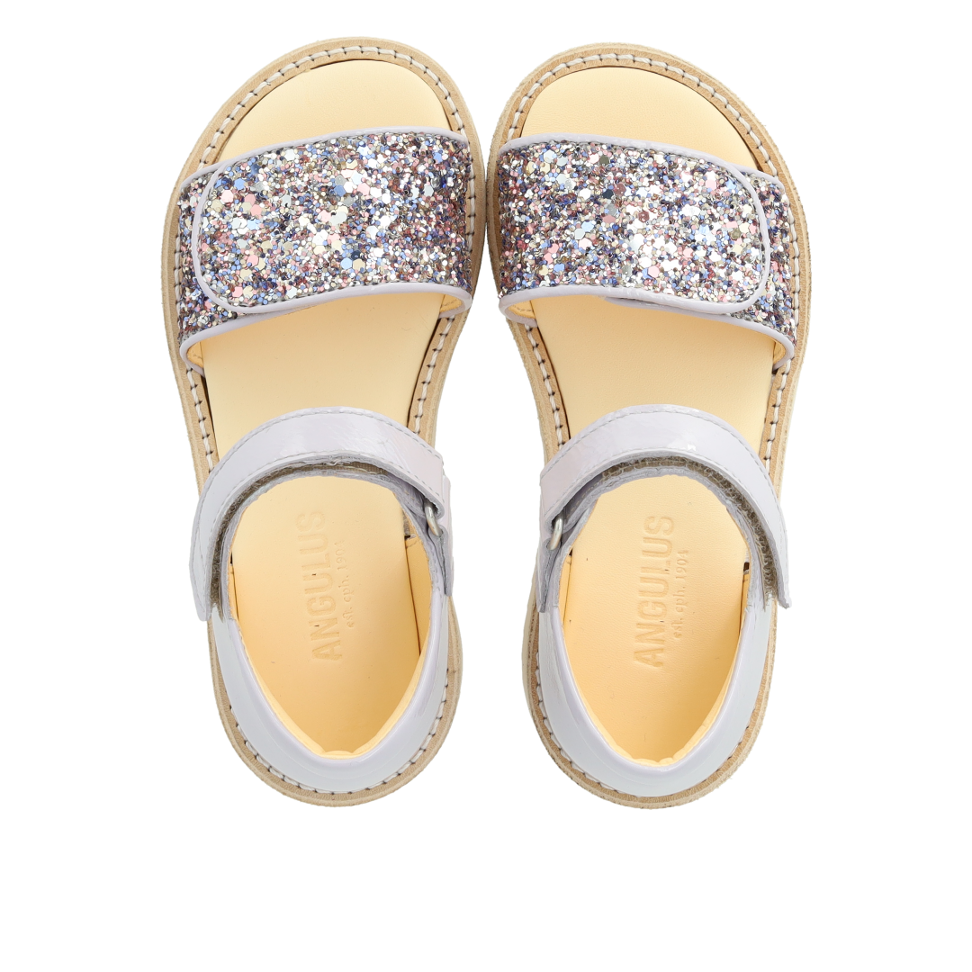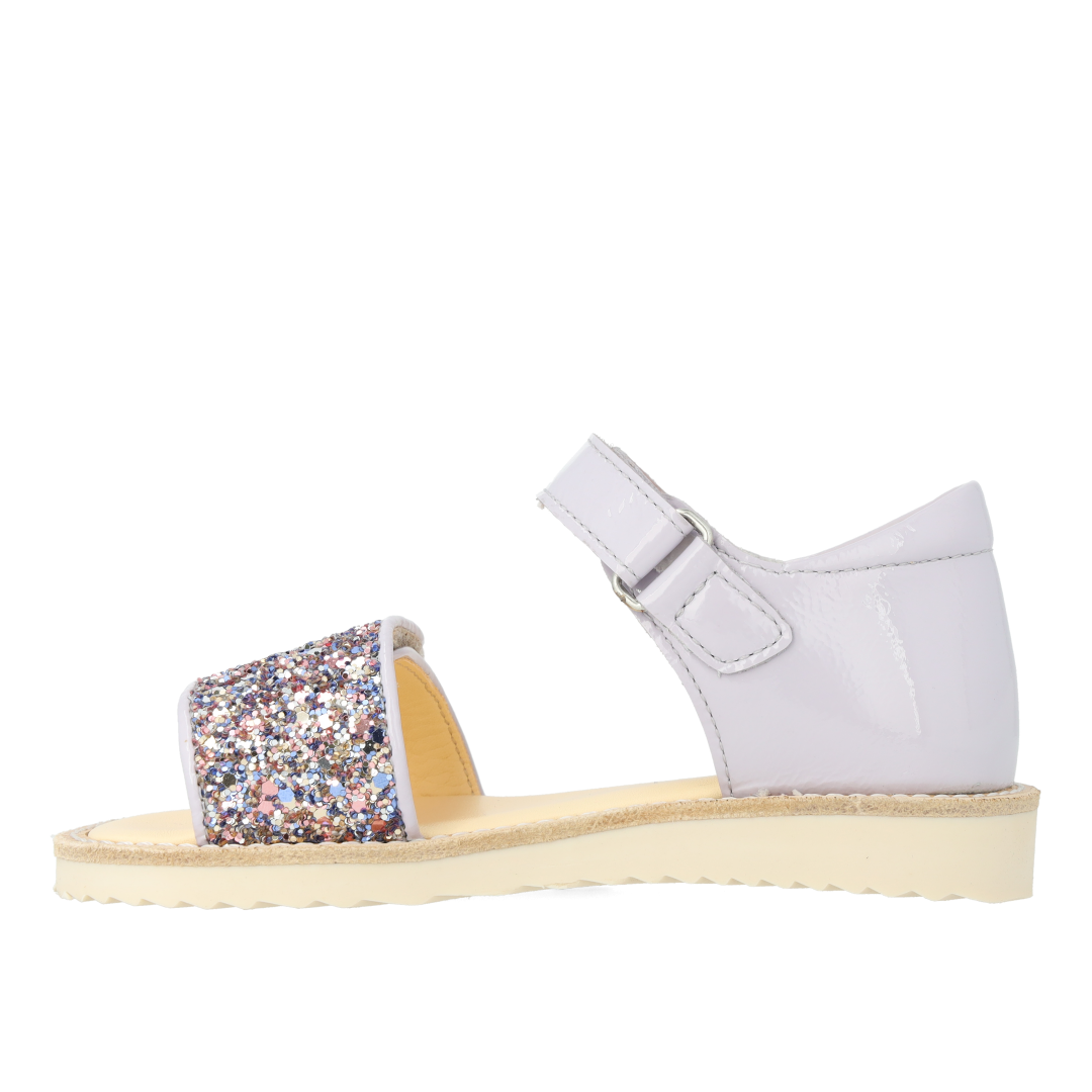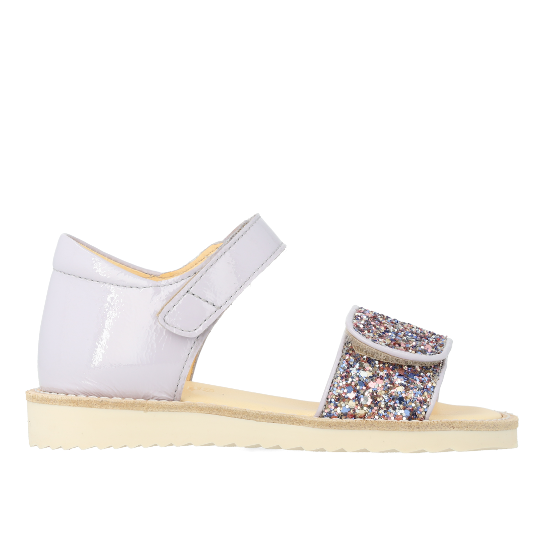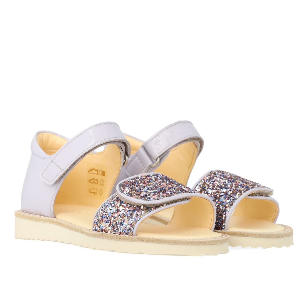 Laksandal med funklende glitterdetalje. Sandalen har justerbar velcrorem, åben tå, vatteret indersål, kromfrit læderfoer, en fast hælkappe med præget logo og polstret krave for ekstra komfort og støtte og en blød og fleksibel gummisål. Udformet i naturligt og åndbart læder med kanvasbaseret glitter. Designet i Danmark og håndlavet med kærlighed i Portugal. Mål altid barnets fod inden du køber, så du får købt den rigtige størrelse. Vi anbefaler et voksetillæg på 1 cm.