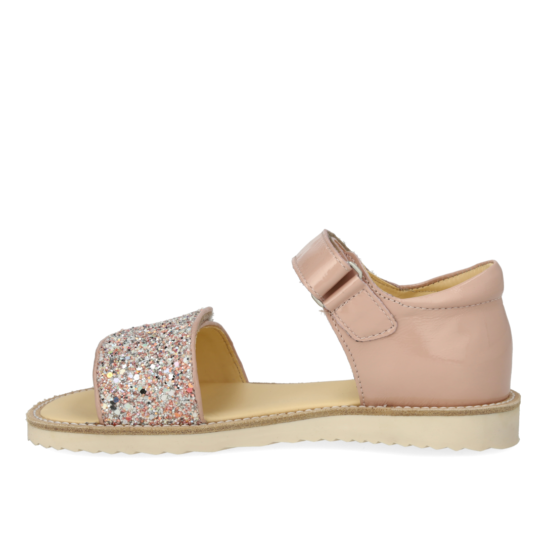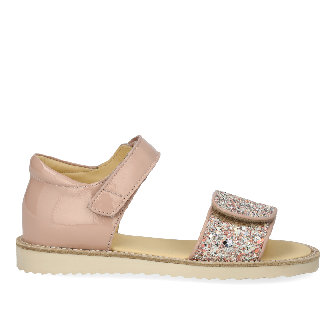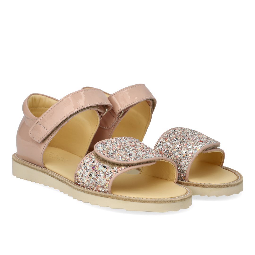 Laksandal med funklende glitterdetalje. Sandalen har justerbar velcrorem, åben tå, vatteret indersål, kromfrit læderfoer, en fast hælkappe med præget logo og polstret krave for ekstra komfort og støtte og en blød og fleksibel gummisål. Udformet i naturligt og åndbart læder med kanvasbaseret glitter. Designet i Danmark og håndlavet med kærlighed i Portugal. Mål altid barnets fod inden du køber, så du får købt den rigtige størrelse. Vi anbefaler et voksetillæg på 1 cm.