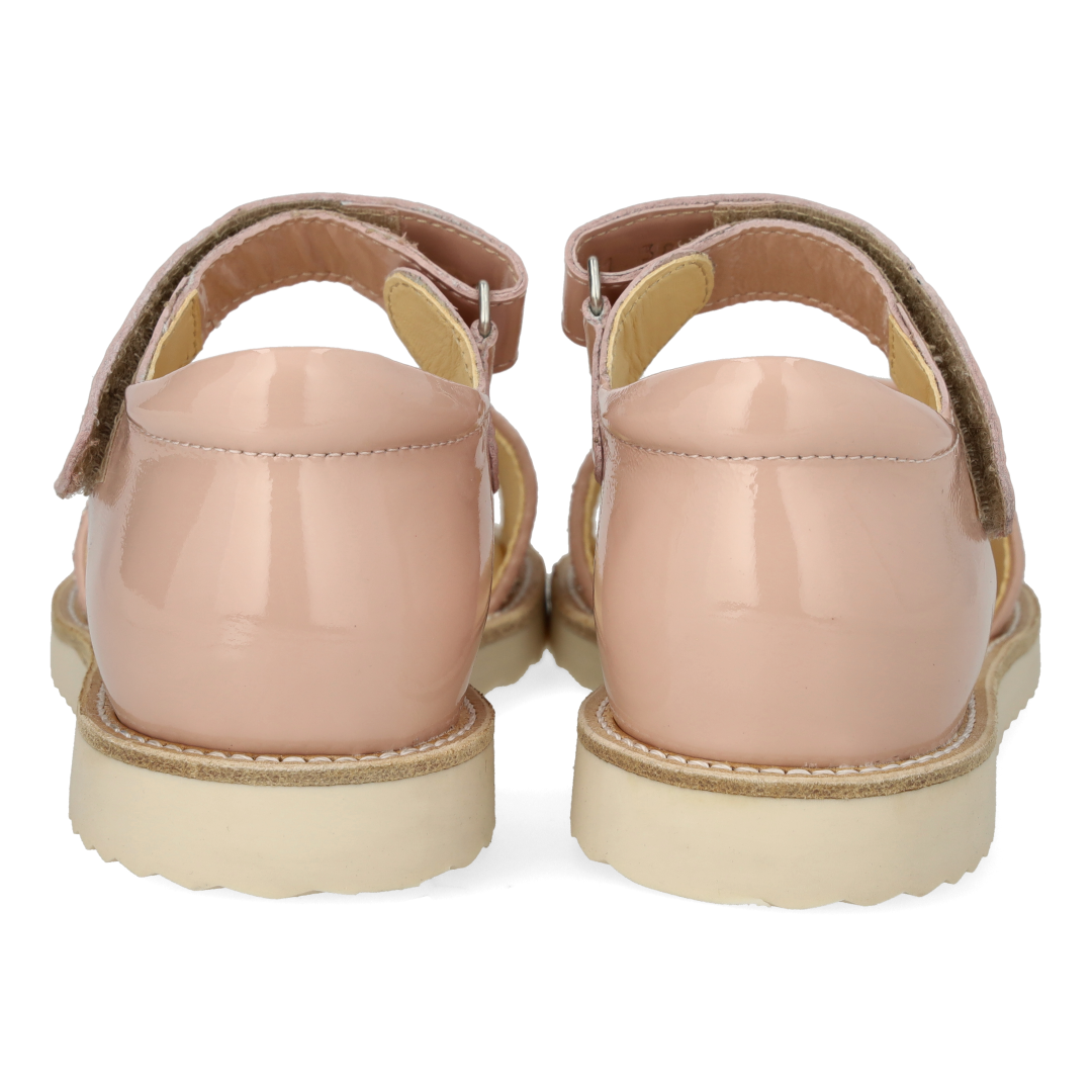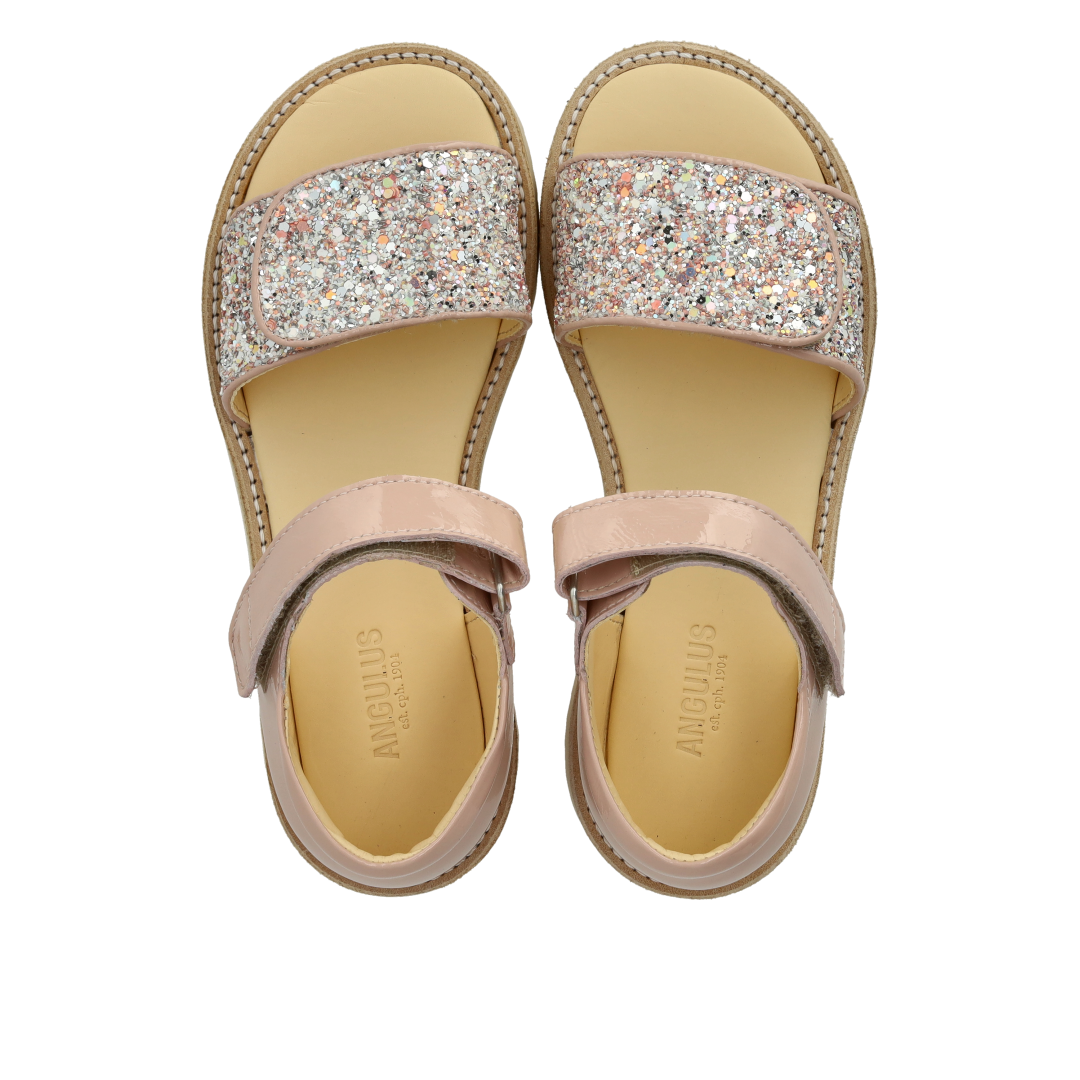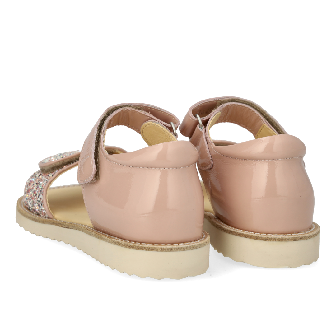 Laksandal med funklende glitterdetalje. Sandalen har justerbar velcrorem, åben tå, vatteret indersål, kromfrit læderfoer, en fast hælkappe med præget logo og polstret krave for ekstra komfort og støtte og en blød og fleksibel gummisål. Udformet i naturligt og åndbart læder med kanvasbaseret glitter. Designet i Danmark og håndlavet med kærlighed i Portugal. Mål altid barnets fod inden du køber, så du får købt den rigtige størrelse. Vi anbefaler et voksetillæg på 1 cm.