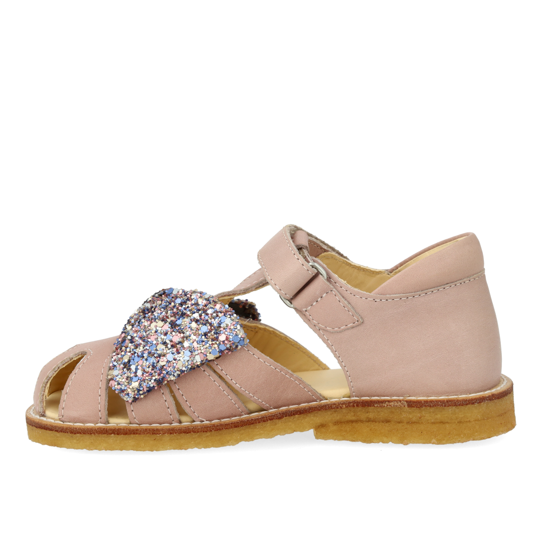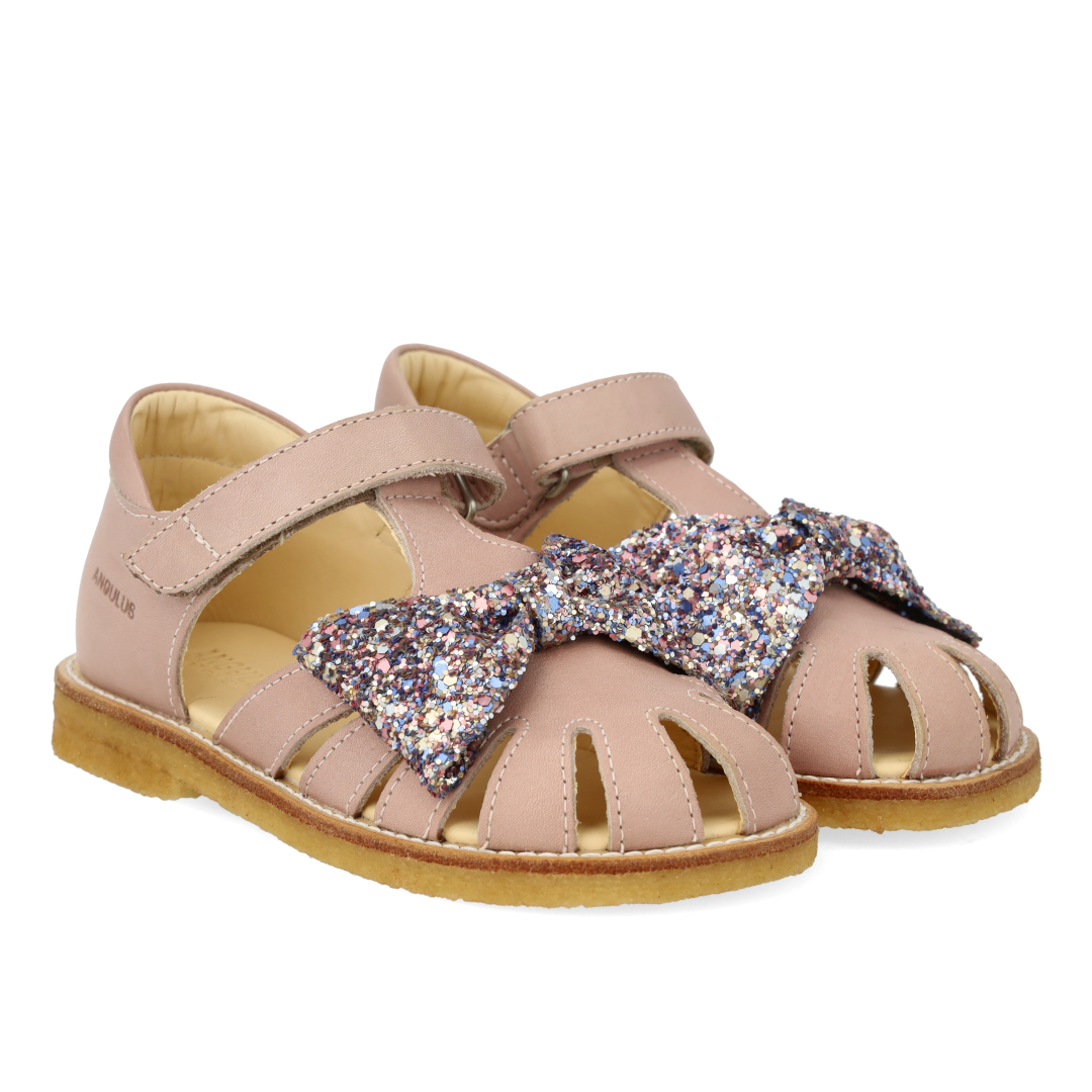 Lædersandal med rummelig pasform og sløjfe i funklende glitter. Sandalen har justerbar velcrorem, lukket tå, vatteret indersål, kromfrit læderfoer, en fast hælkappe med præget logo og polstret krave for ekstra komfort og støtte og en let, blød og fleksibel rågummisål skåret med fokus på svangstøtte. Udformet i naturligt og åndbart læder med kanvasbaseret glitter. Designet i Danmark og håndlavet med kærlighed i Portugal. Mål altid barnets fod inden du køber, så du får købt den rigtige størrelse. Vi anbefaler et voksetillæg på 1 cm.