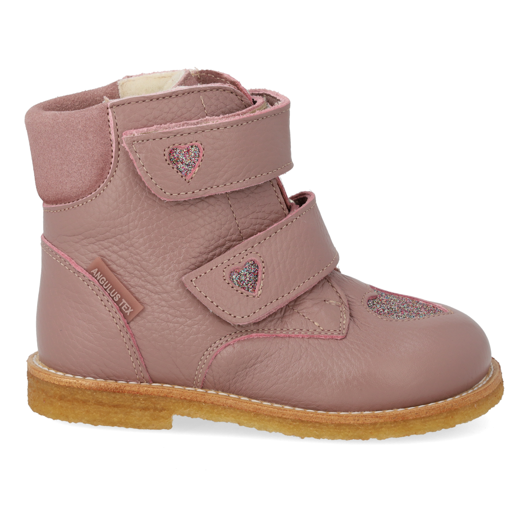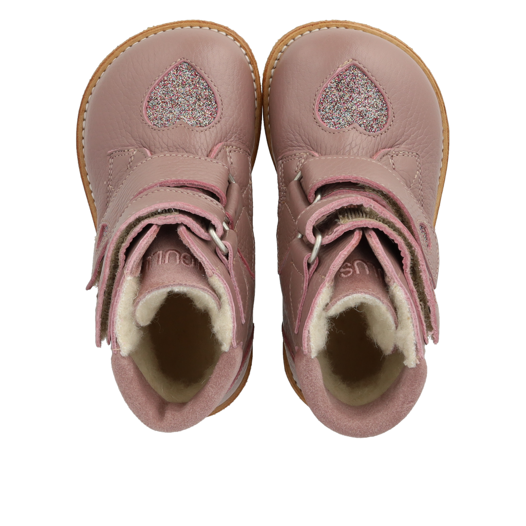 Velcro TEX-støvle i læder med funklende glitterhjerter og blødt merino uldfoer, der er designet til at holde små fødder varme og tørre, uanset vejret. Skoen har justerbare velcroremme for optimalt personligt fit, vatteret indersål, en fast hælkappe med polstret ruskindskrave for ekstra stabilitet, komfort og støtte, dekorativ stikningsrand og en let, blød og fleksibel FSC-certificeret rågummisål i fornybart naturgummi, der er udskåret med fokus på svangstøtte. Udformet i åndbart skind med PFAS-fri TEX-membran og 100% merino uldfoer. Designet i Danmark og håndlavet med kærlighed i Portugal. Mål altid barnets fod inden du køber, så du får købt den rigtige størrelse. Vi anbefaler et voksetillæg på 1-1,5 cm.