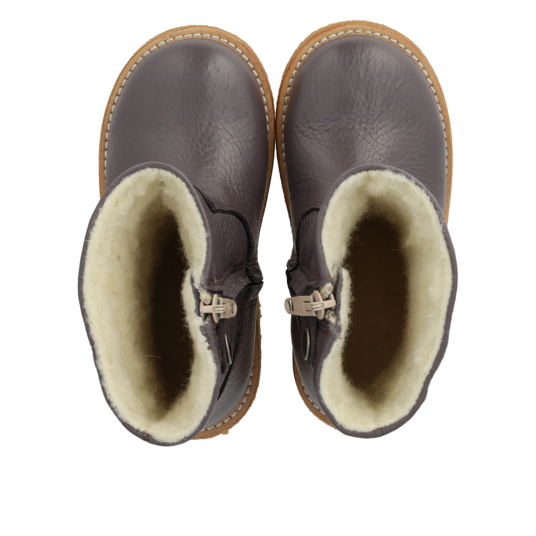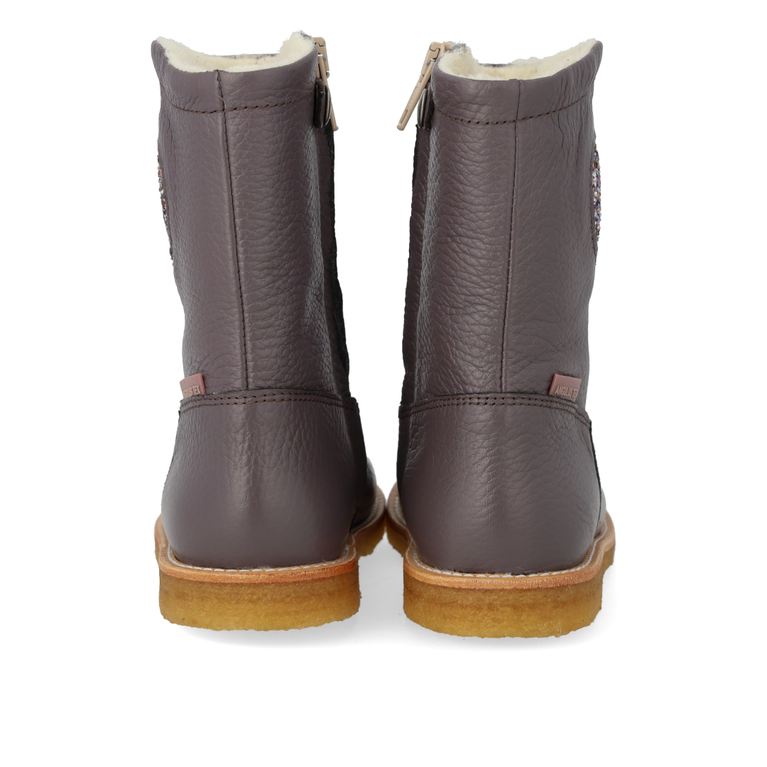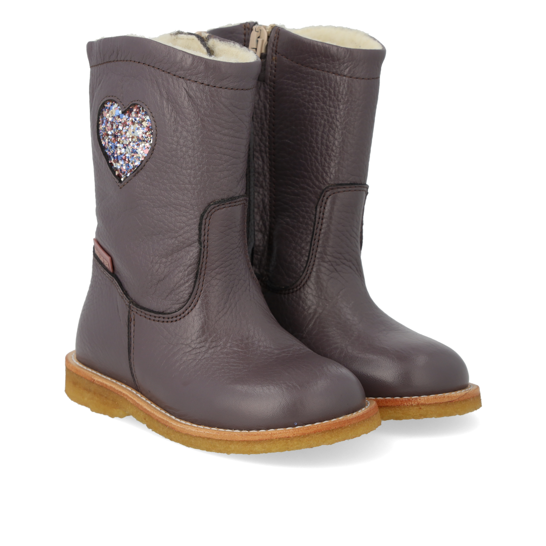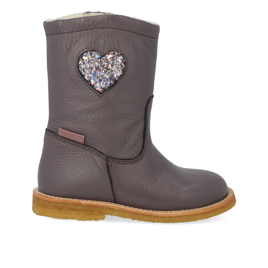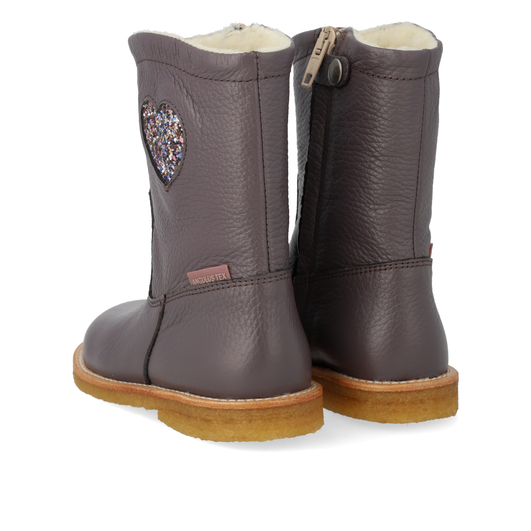 Vandafvisende TEX-støvle i læder med funklende glitterhjerte. Støvlen har et højt skaft med lynlåslukning og trykknap i den ene side, åndbart uldfoer, fast hælkappe for støtte og en let, blød og fleksibel rågummisål i fornybar naturgummi. Udformet i naturligt og åndbart skind med PFAS-fri TEX-membran. Designet i Danmark og håndlavet med kærlighed i Portugal. Mål altid barnets fod inden du køber, så du får købt den rigtige størrelse. Vi anbefaler et voksetillæg på 1-1,5 cm.