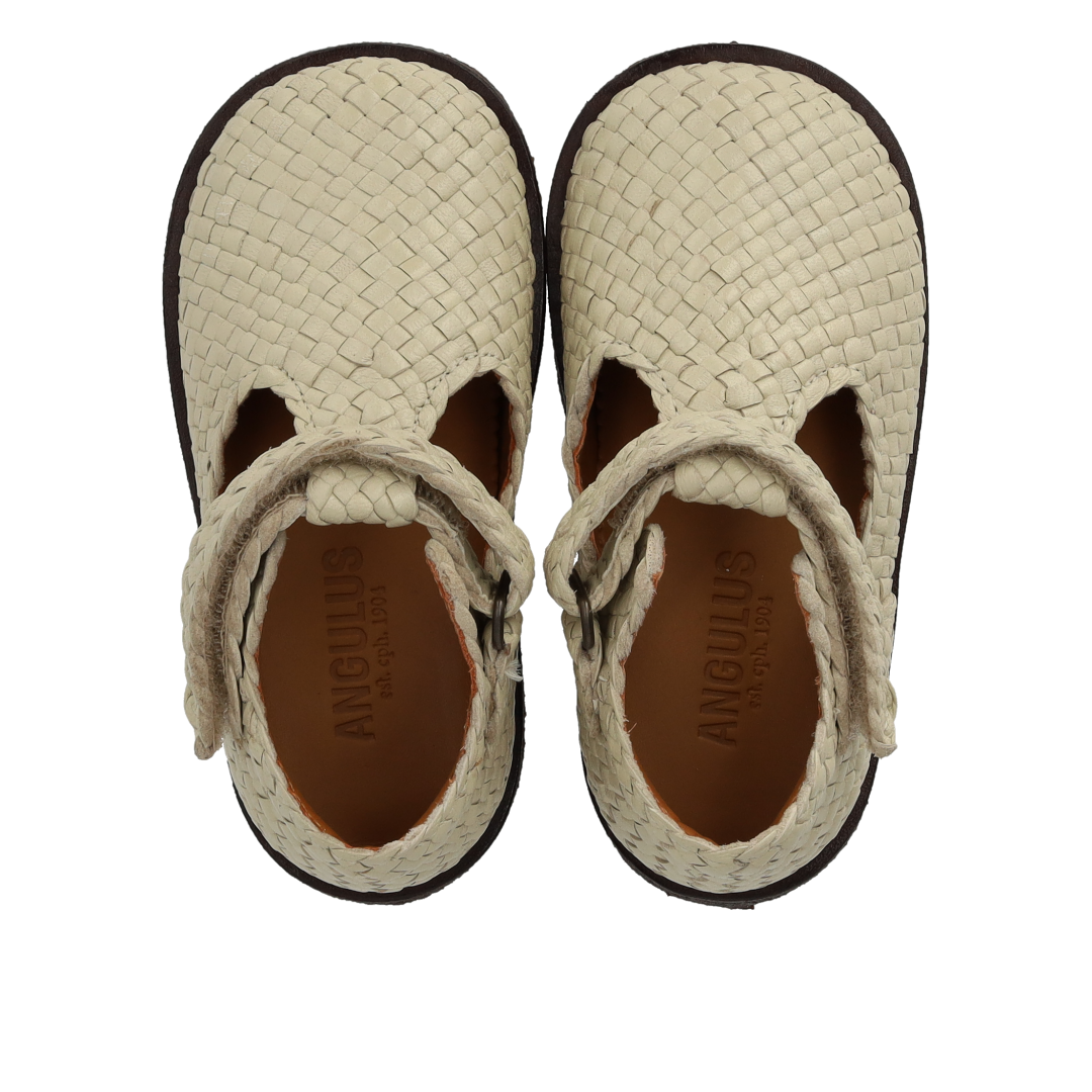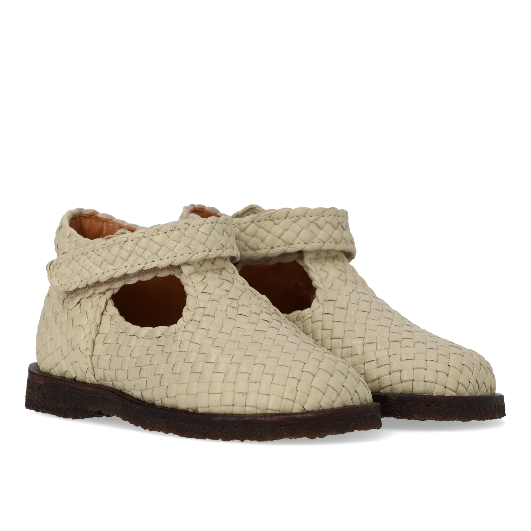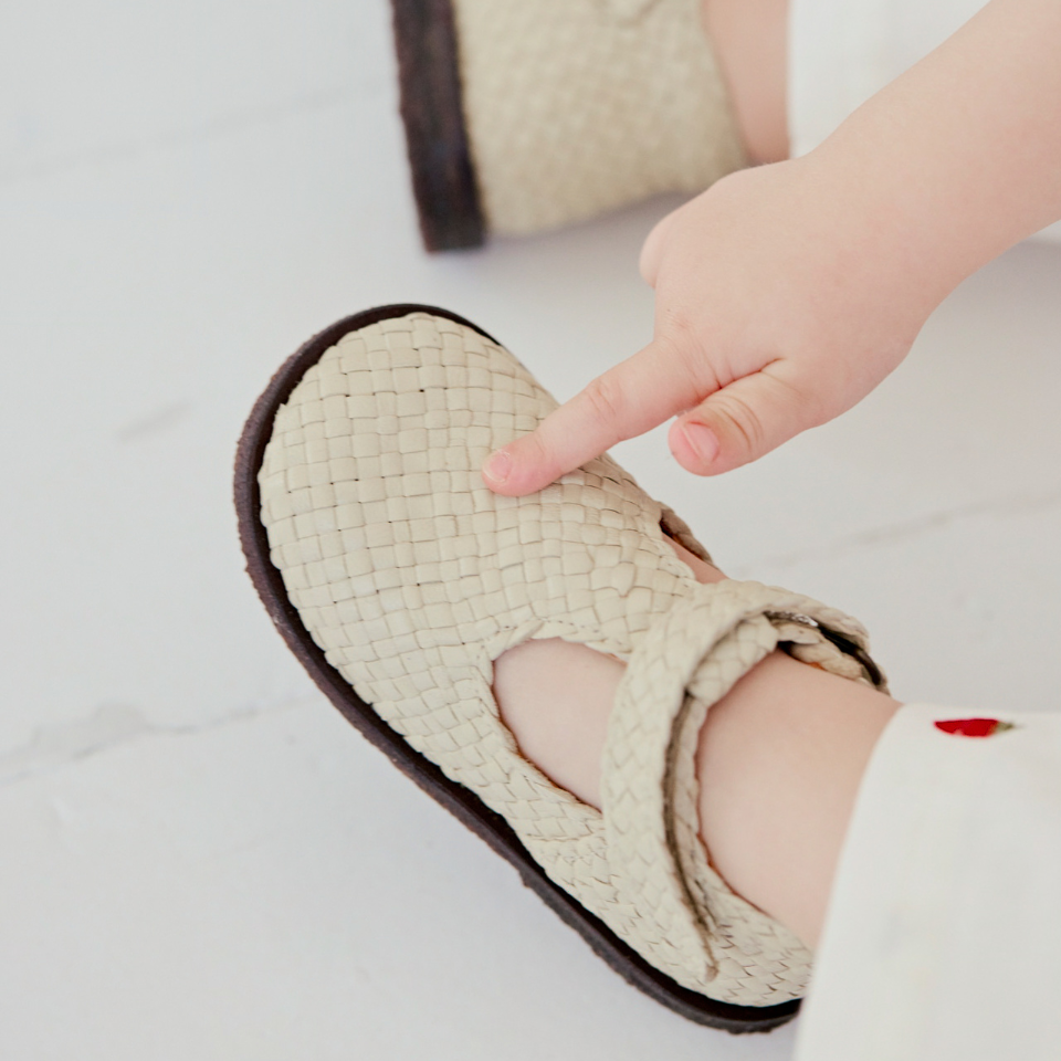 Håndflettet begynder tullesko i læder. Tulleskoen har T-strap og justerbar velcrorem, fast hælkappe med polstret krave for ekstra komfort, stabilitet og støtte, vatteret indersål, kromfrit læderfoer og en let, blød og fleksibel mørkebrun rågummisål i fornybar naturgummi, der prydes af en dekorativ kontraststikning. Den øverste del af skoen er udformet i naturligt vegetabilsk garvet læder og er håndvævet i Indien, hvilket gør hvert eneste par unikt. Farve og mønster kan variere. Behandl dem med omhu. Udformet i naturligt og åndbart skind. Designet i Danmark og håndlavet med kærlighed i Portugal. Mål altid barnets fod inden du køber, så du får købt den rigtige størrelse. Vi anbefaler et voksetillæg på 1 cm.