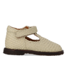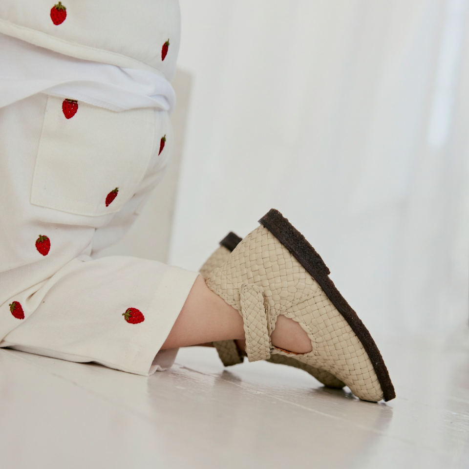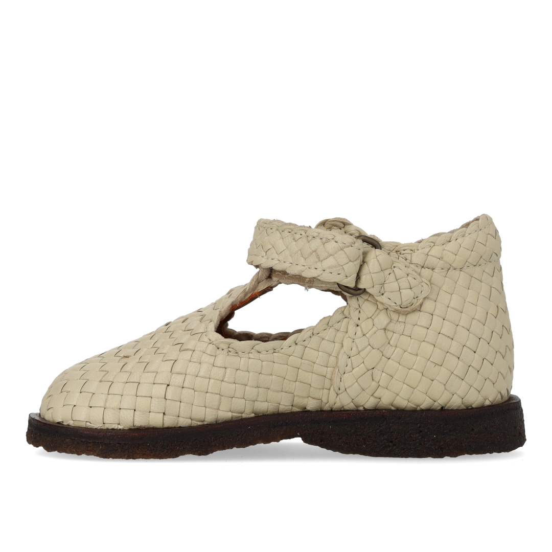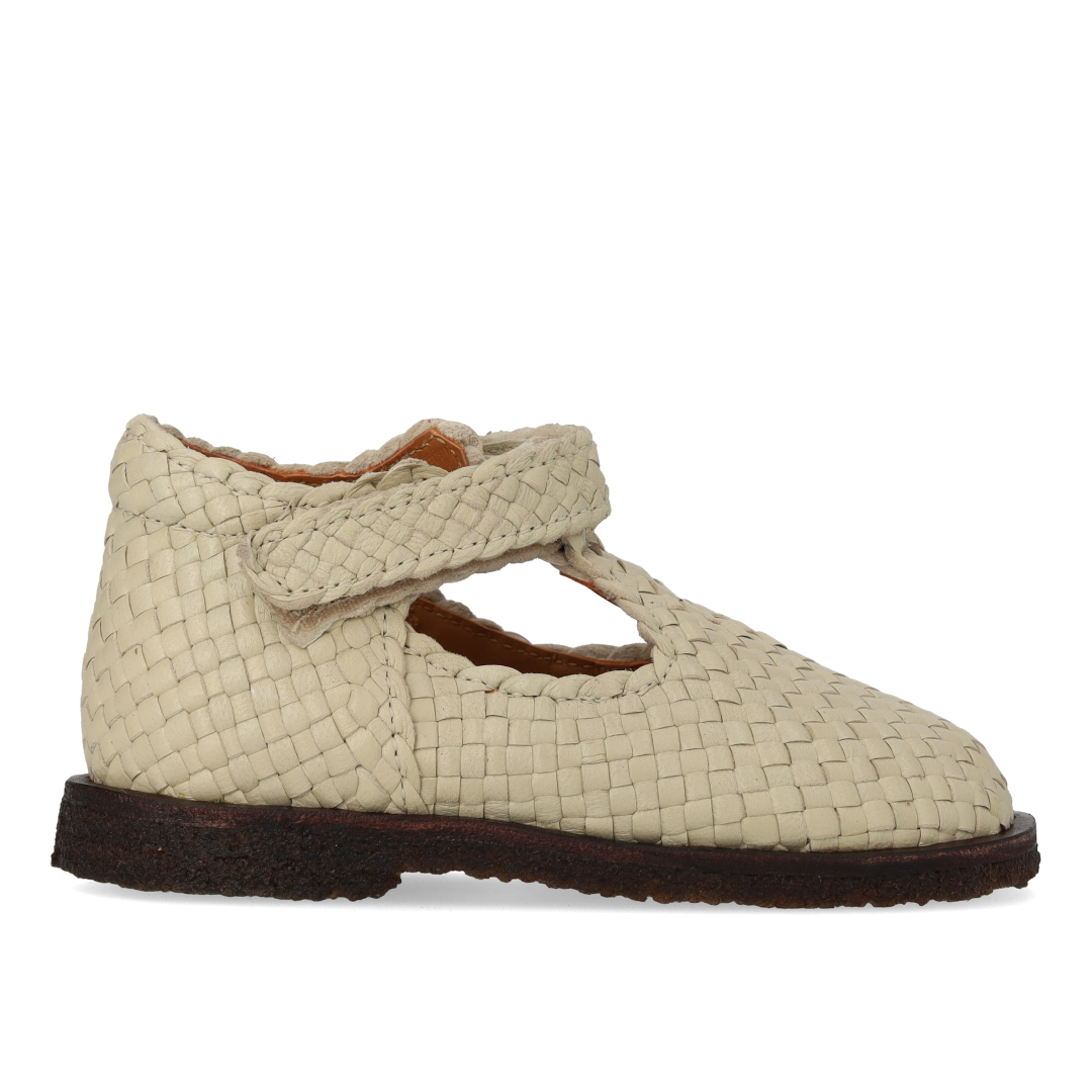 Håndflettet begynder tullesko i læder. Tulleskoen har T-strap og justerbar velcrorem, fast hælkappe med polstret krave for ekstra komfort, stabilitet og støtte, vatteret indersål, kromfrit læderfoer og en let, blød og fleksibel mørkebrun rågummisål i fornybar naturgummi, der prydes af en dekorativ kontraststikning. Den øverste del af skoen er udformet i naturligt vegetabilsk garvet læder og er håndvævet i Indien, hvilket gør hvert eneste par unikt. Farve og mønster kan variere. Behandl dem med omhu. Udformet i naturligt og åndbart skind. Designet i Danmark og håndlavet med kærlighed i Portugal. Mål altid barnets fod inden du køber, så du får købt den rigtige størrelse. Vi anbefaler et voksetillæg på 1 cm.