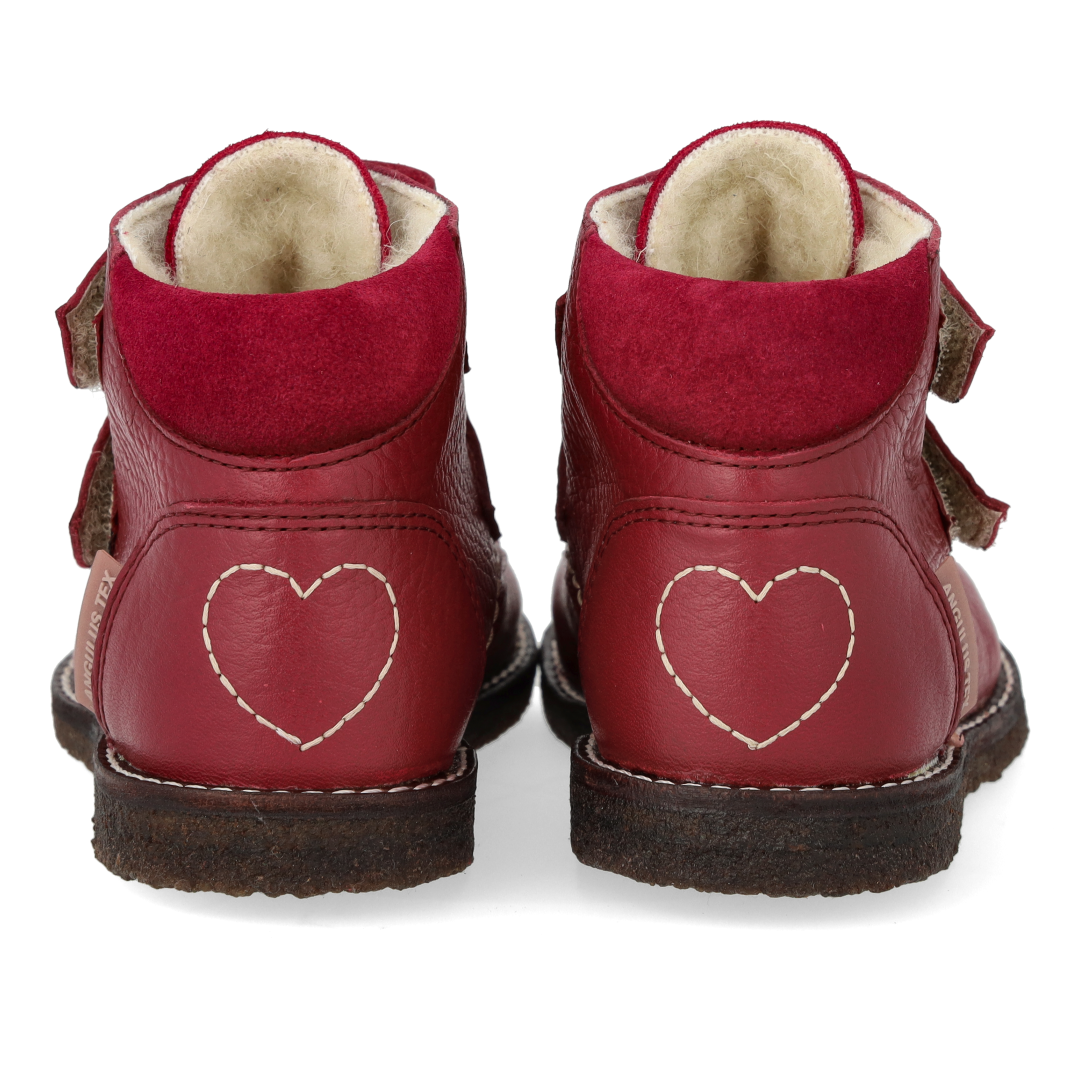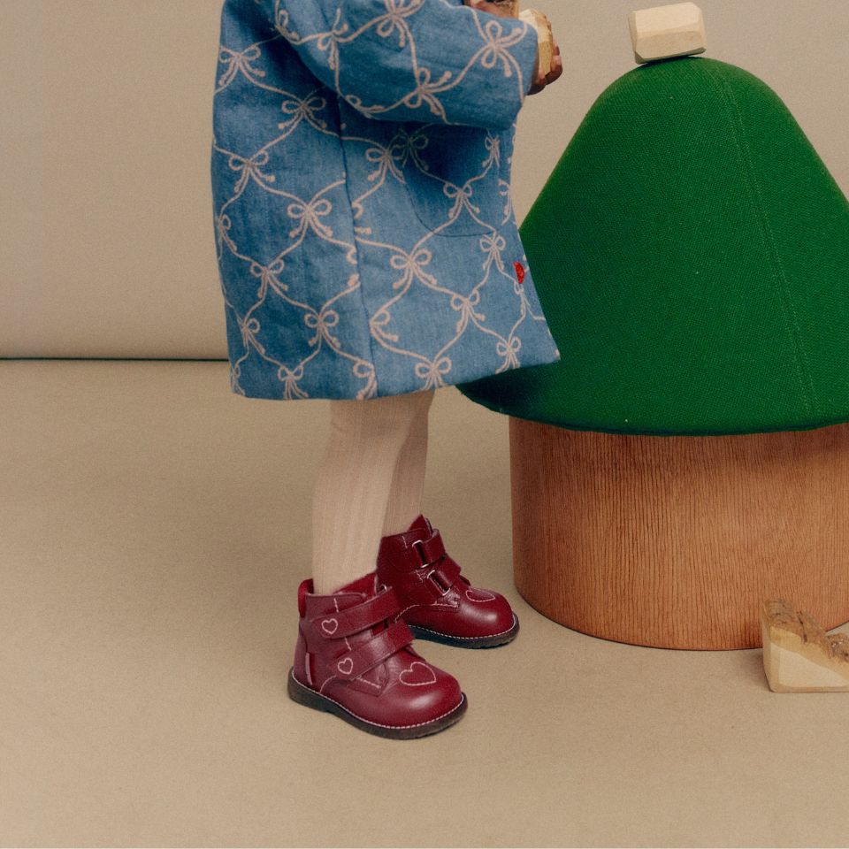 Rummelig begynder TEX-støvle i læder med hjertebroderi, der er designet til at holde små fødder varme og tørre, uanset vejret. Skoen har justerbare velcroremme for optimalt personligt fit, vatteret indersål, blødt merino uldfoer, en fast hælkappe med polstret ruskindskrave for ekstra stabilitet, komfort og støtte, dekorativ stikningsrand og en let, blød og fleksibel mørkebrun FSC-certificeret rågummisål i fornybart naturgummi, der er udskåret med fokus på svangstøtte. Udformet i naturligt og åndbart læder med PFAS-fri TEX-membran og 100% merino uldfoer. Designet i Danmark og håndlavet med kærlighed i Portugal. Mål altid barnets fod inden du køber, så du får købt den rigtige størrelse. Vi anbefaler et voksetillæg på 1-1,2 cm.