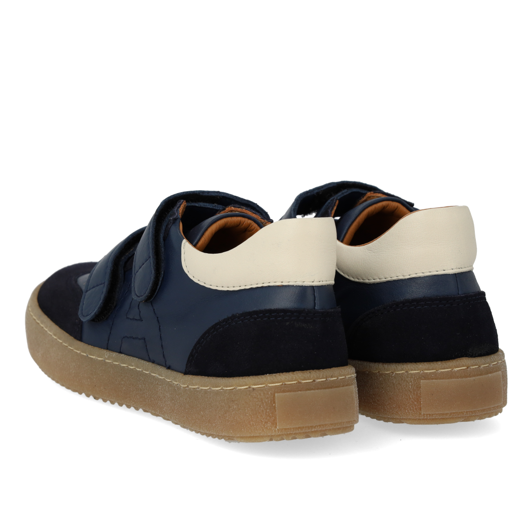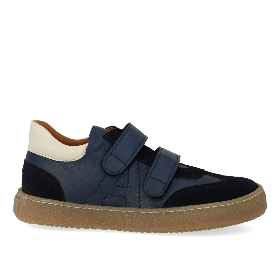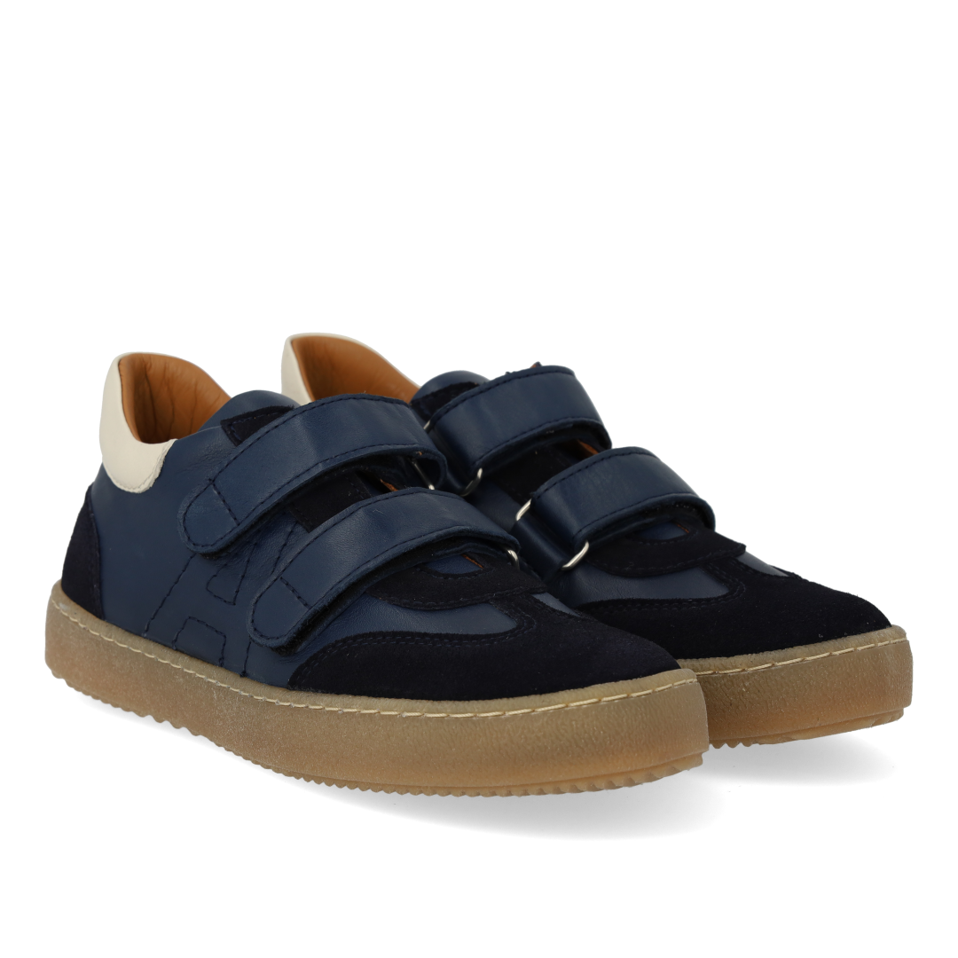 Sporty court style sneaker i læder og ruskind. Sneakeren har justerbare velcroremme for optimalt personligt fit, der også gør det nemt at få den af og på, fast hælkappe med polstret kontrastkrave for ekstra stabilitet og komfort, vatteret indersål, kromfrit læderfoer samt en let, blød og fleksibel skridsikker gummisål. Udformet i naturligt og åndbart skind. Designet i Danmark og håndlavet med kærlighed i Portugal. Mål altid barnets fod inden du køber, så du får købt den rigtige størrelse. Vi anbefaler et voksetillæg på 0,8 cm.