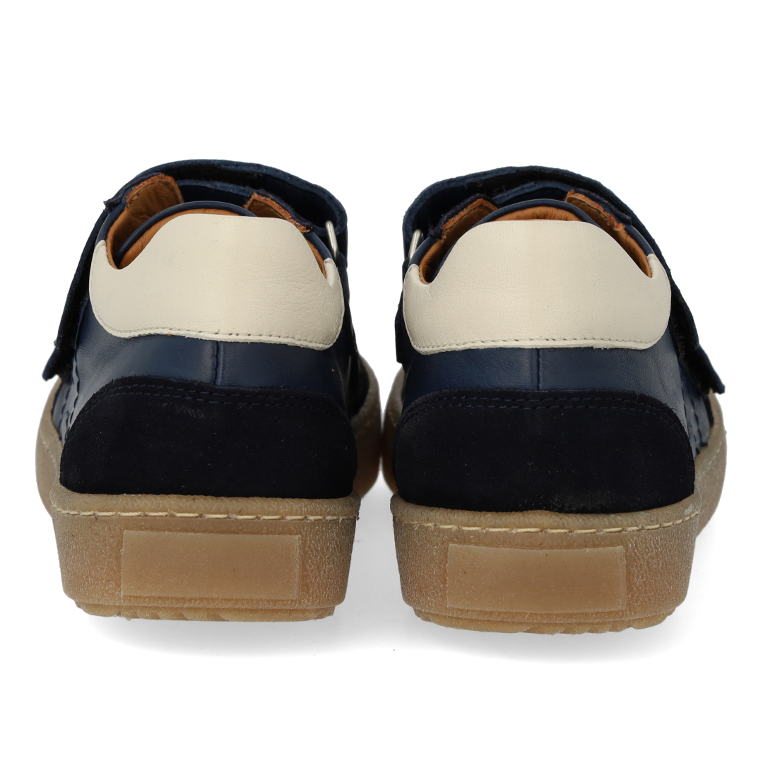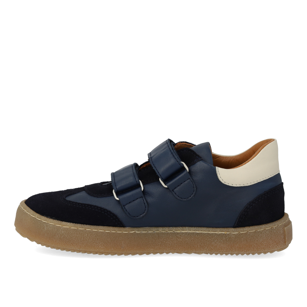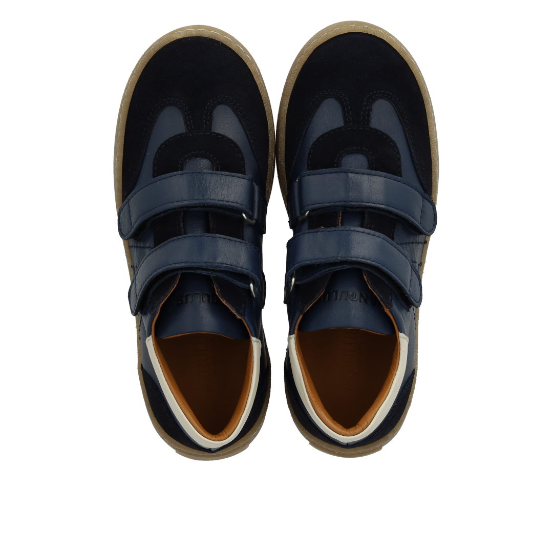 Sporty court style sneaker i læder og ruskind. Sneakeren har justerbare velcroremme for optimalt personligt fit, der også gør det nemt at få den af og på, fast hælkappe med polstret kontrastkrave for ekstra stabilitet og komfort, vatteret indersål, kromfrit læderfoer samt en let, blød og fleksibel skridsikker gummisål. Udformet i naturligt og åndbart skind. Designet i Danmark og håndlavet med kærlighed i Portugal. Mål altid barnets fod inden du køber, så du får købt den rigtige størrelse. Vi anbefaler et voksetillæg på 0,8 cm.