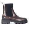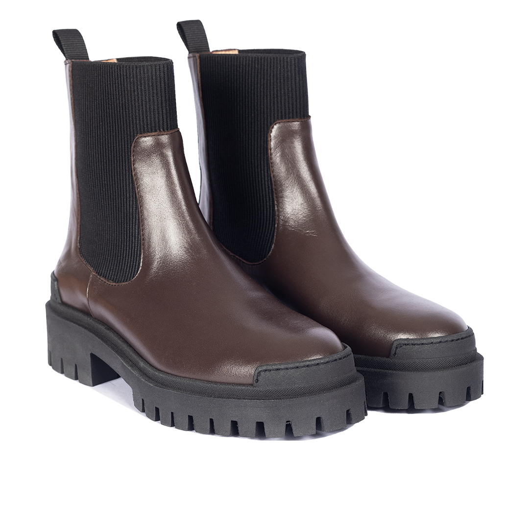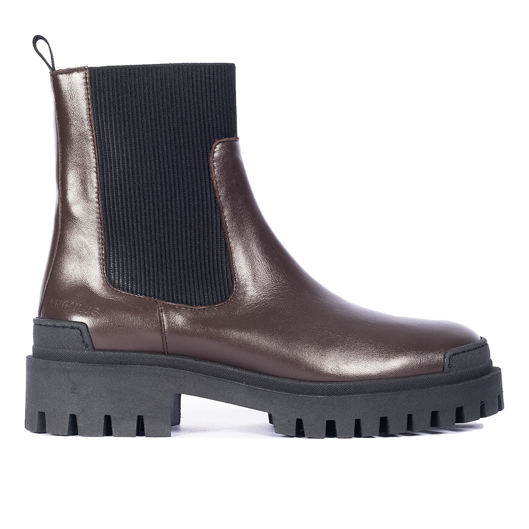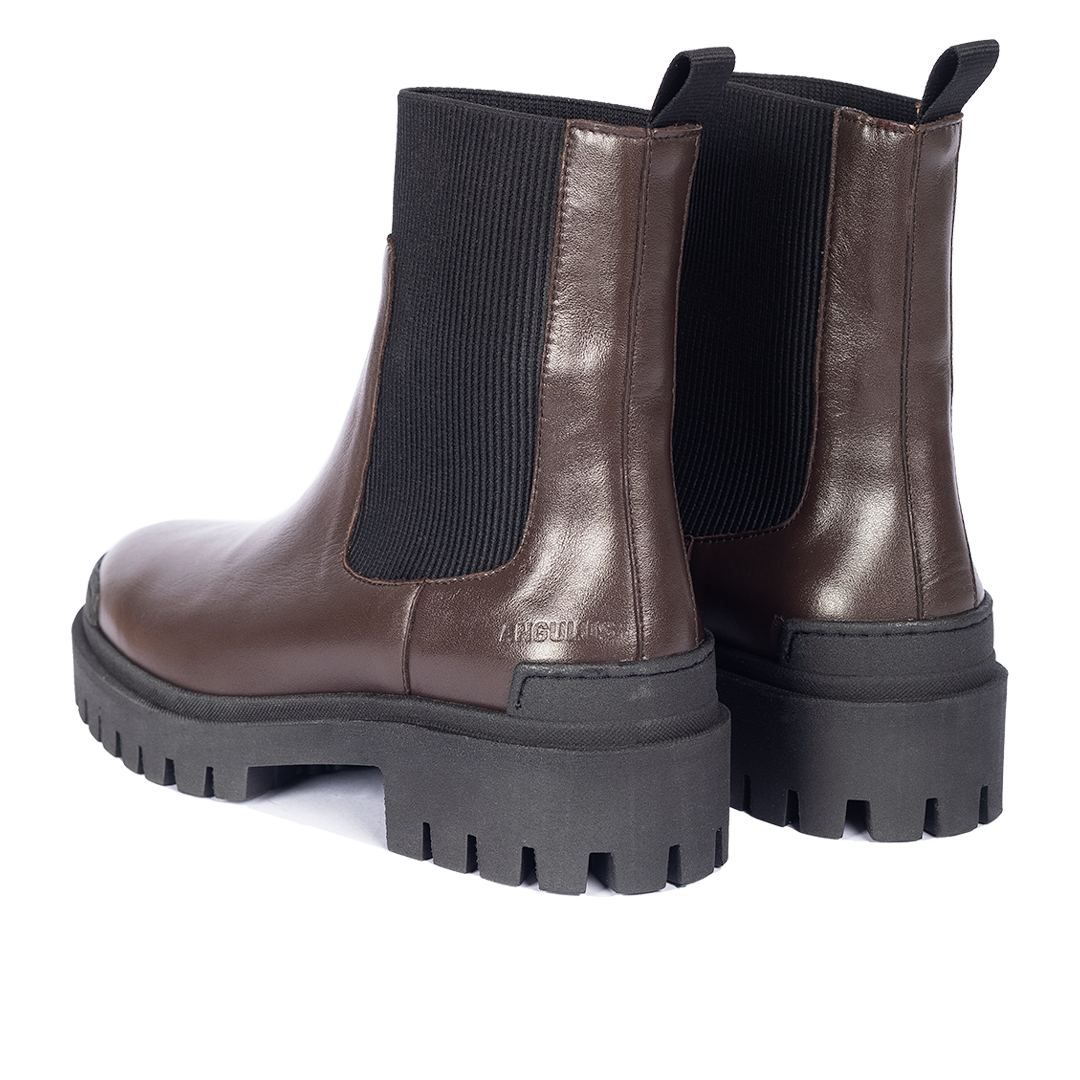 Chunky Chelsea støvle i læder med sort tracksål. Støvlen har en rund snude, et tætsiddende skaft med rem og sort ribelastik, der gør støvlen nem at få af og på, fleksibel sort gummi tracksål, der går op over snude og hæl, præget logo ved hælparti, vatteret indersål, læderfoer og er udformet i naturligt og åndbart skind. Designet i Danmark og håndlavet med kærlighed i Portugal. Støvlen er størrelsessvarande, men hvis du ligger imellem to størrelser, anbefaler vi at du tager den største størrelse.