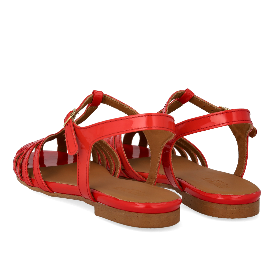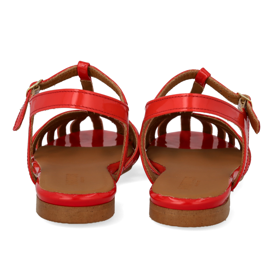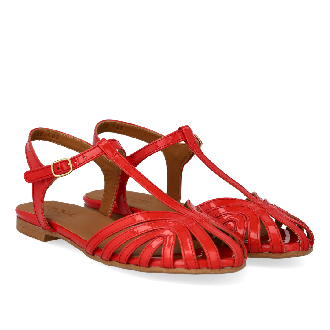 Flad elegant sandal med smuk organisk frontdetalje. Sandalen har T-strap med justerbar spændelukning, vatteret indersål, kromfrit læderfoer og en let tunitsål. Udformet i naturligt og åndbart skind. Designet i Danmark og håndlavet med kærlighed i Portugal.