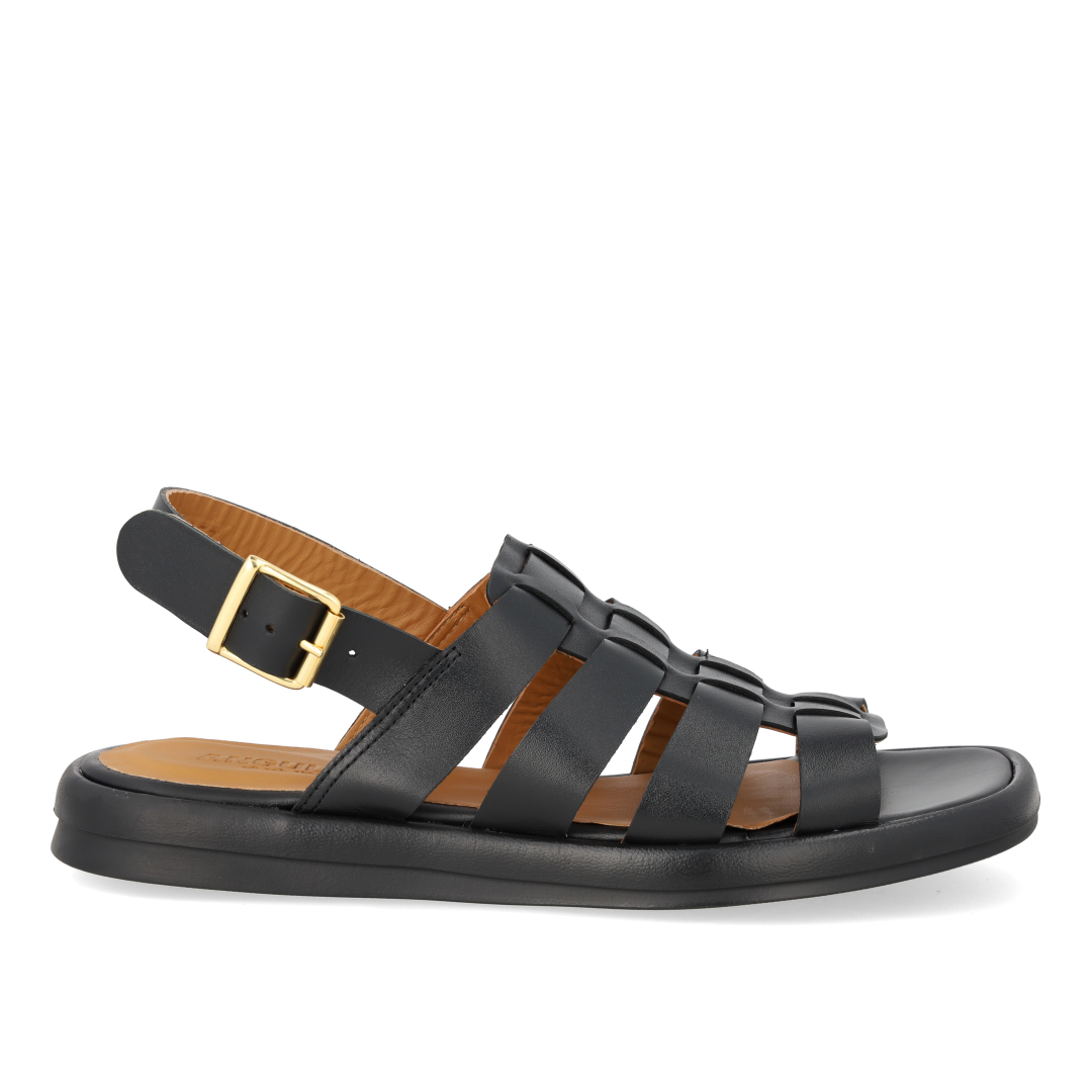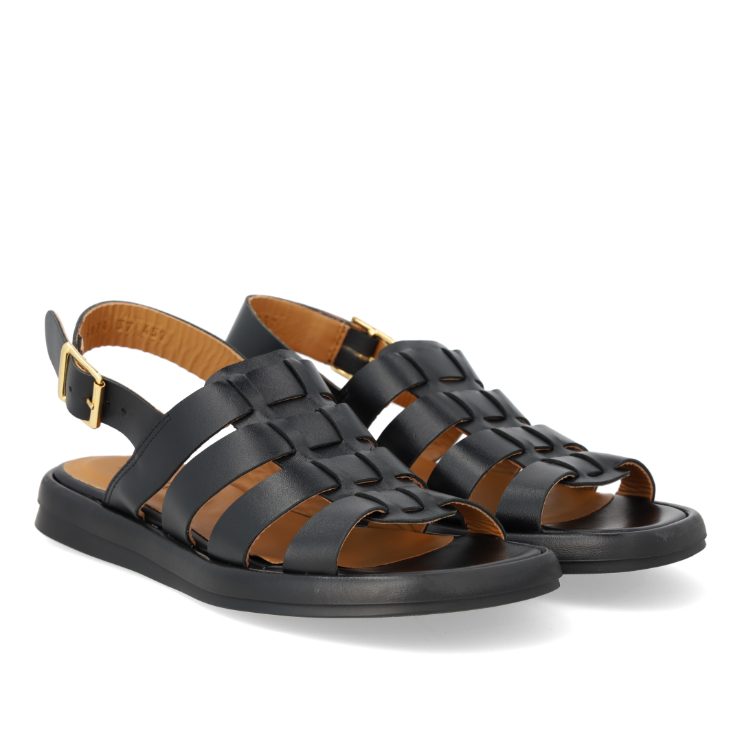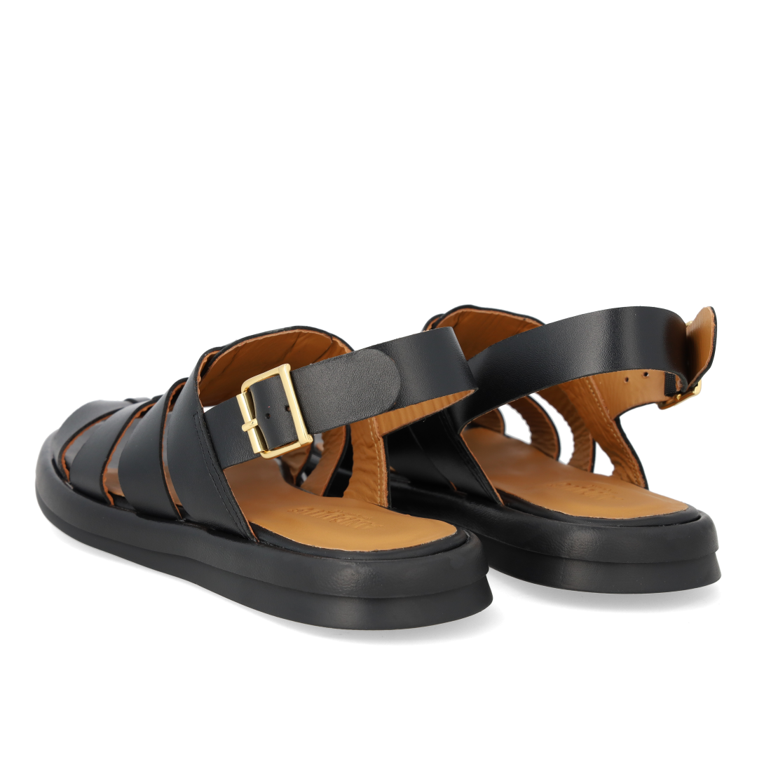Gladiator-inspireret remsandal i læder. Sandalen har en rundet snude, vatteret indersål og foer i kromfrit læder, justerbar ankelrem med guldspænde og en let og fleksibel sort gummisål. Udformet i naturligt og åndbart skind. Designet i Danmark og håndlavet med kærlighed i Portugal.