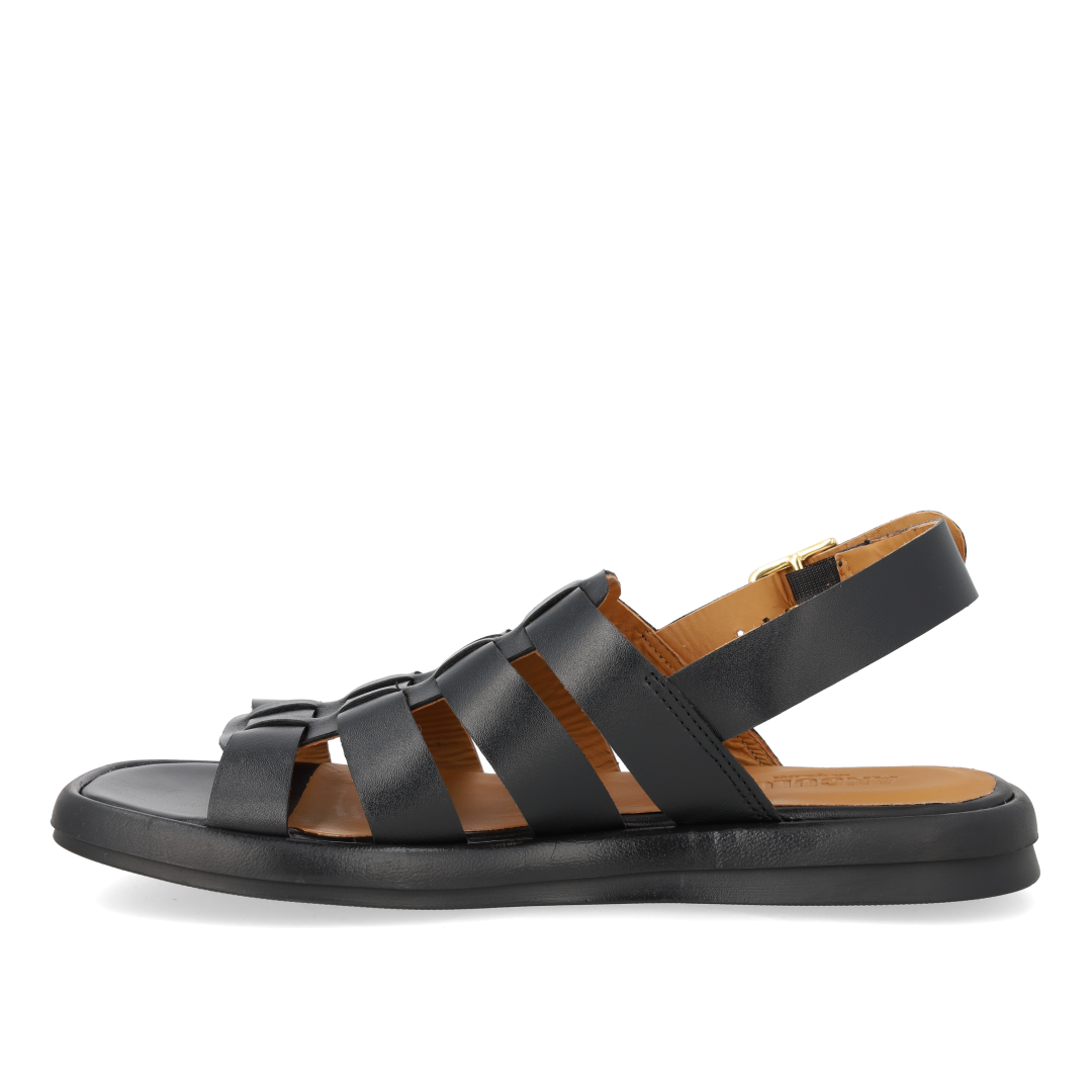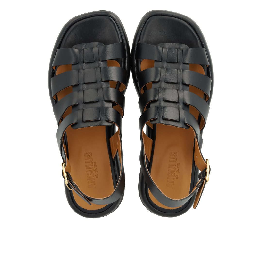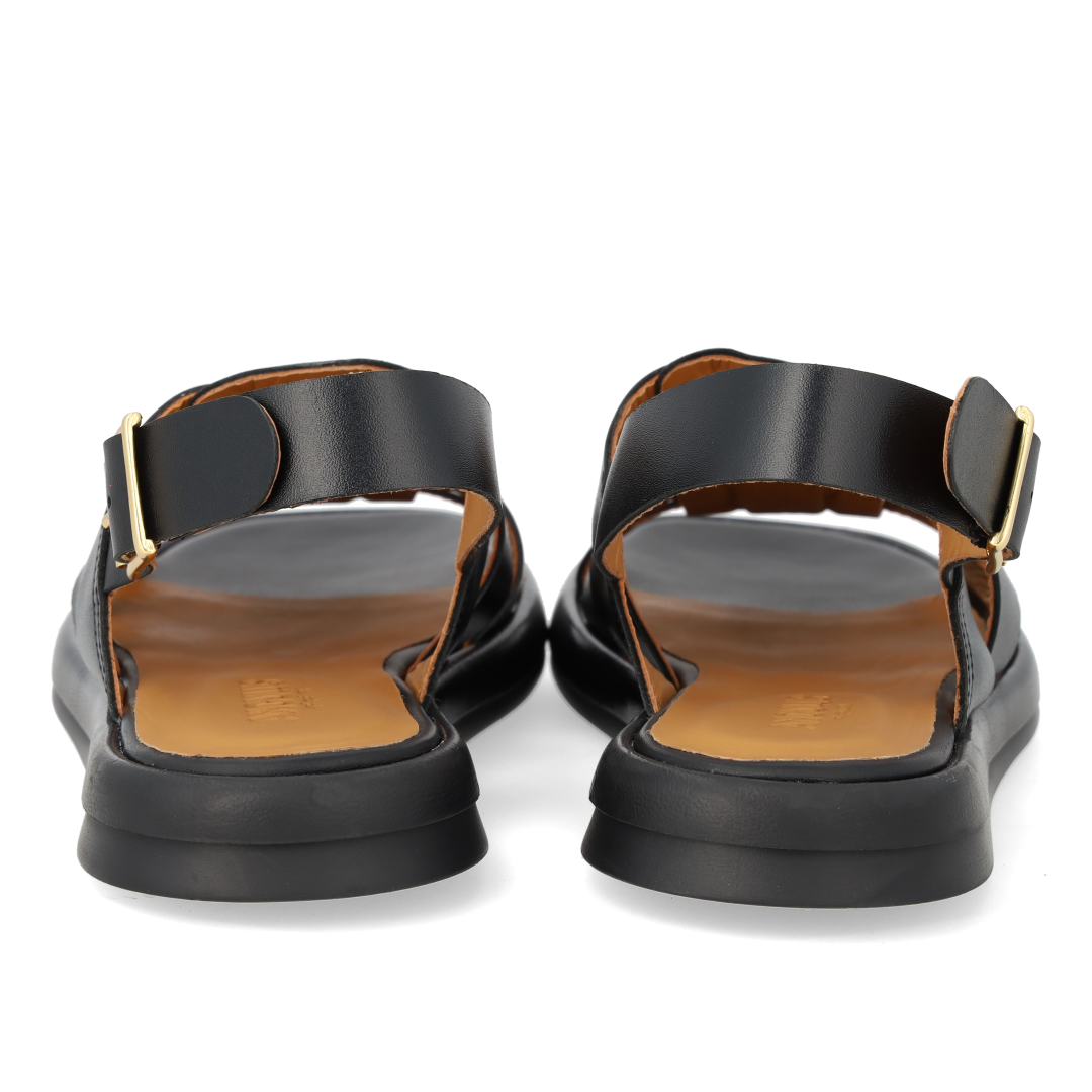Gladiator-inspireret remsandal i læder. Sandalen har en rundet snude, vatteret indersål og foer i kromfrit læder, justerbar ankelrem med guldspænde og en let og fleksibel sort gummisål. Udformet i naturligt og åndbart skind. Designet i Danmark og håndlavet med kærlighed i Portugal.
