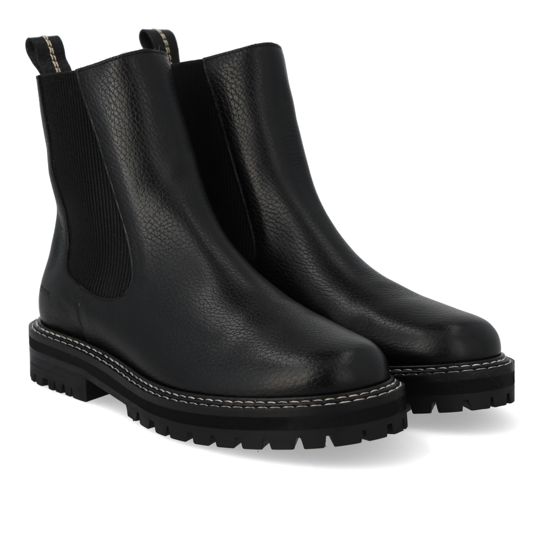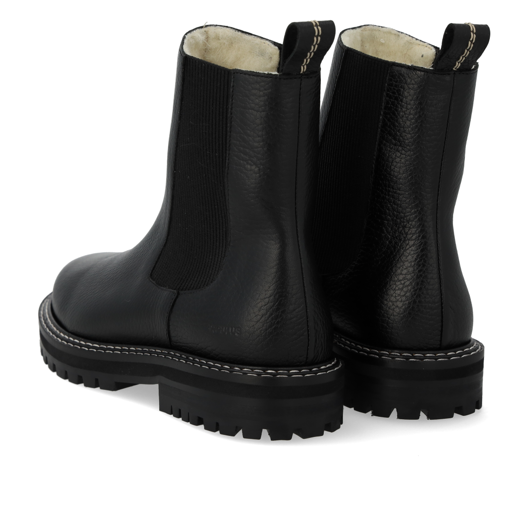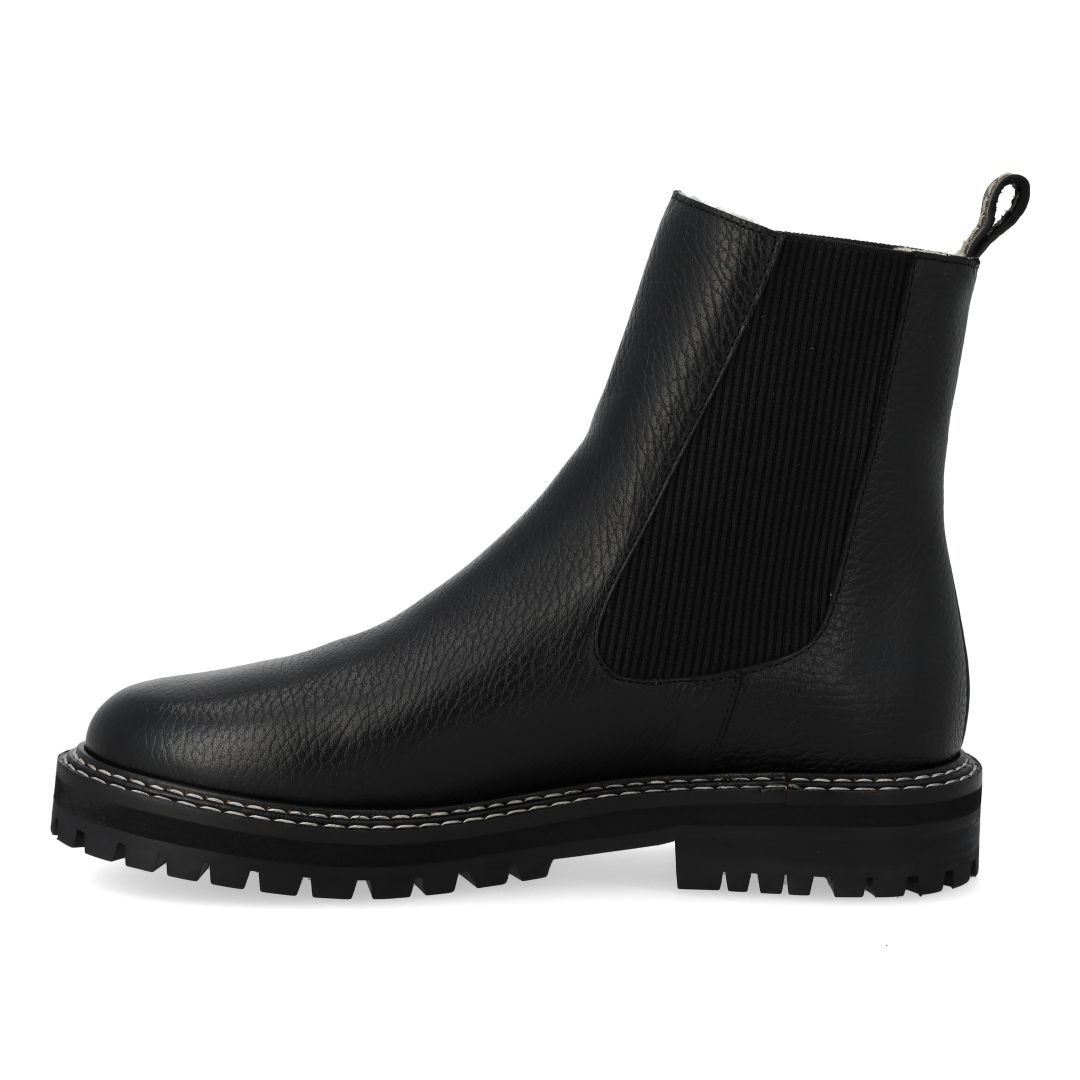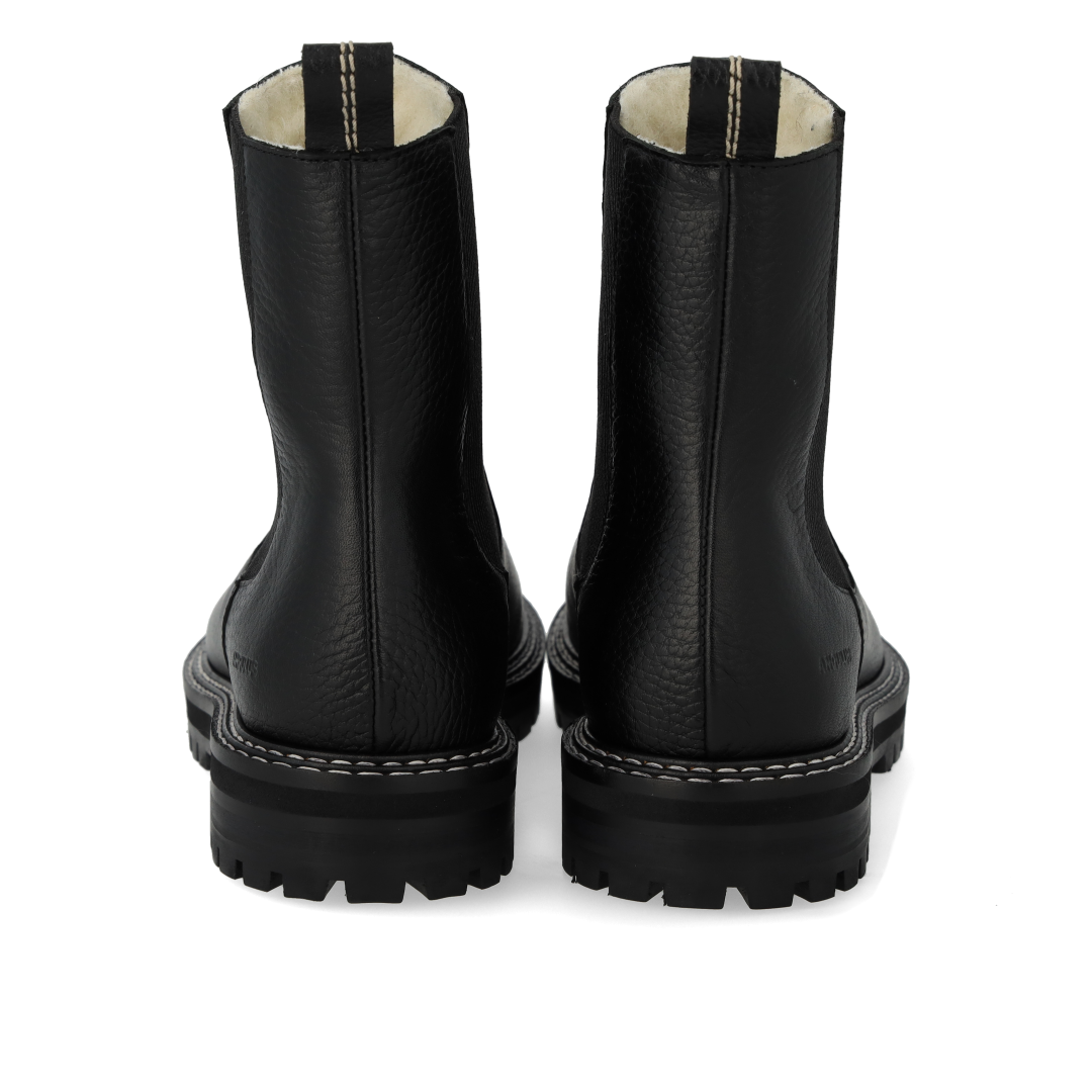 Enkel Chelsea støvle med blødt merino uldfoer. Støvlen har en rund snude, ankelhøjt skaft med funktionel ribelastik og hælstrop, der gør det nemt at få støvlen af og på, vatteret indersål, præget logo på støvlens ene side og en chunky, sort track gummisål med dekorative kontraststikninger. Udformet i naturligt og åndbart skind. Designet i Danmark og håndlavet med kærlighed i Portugal.