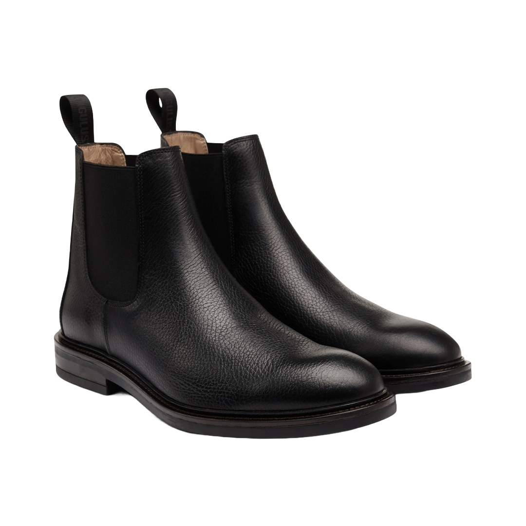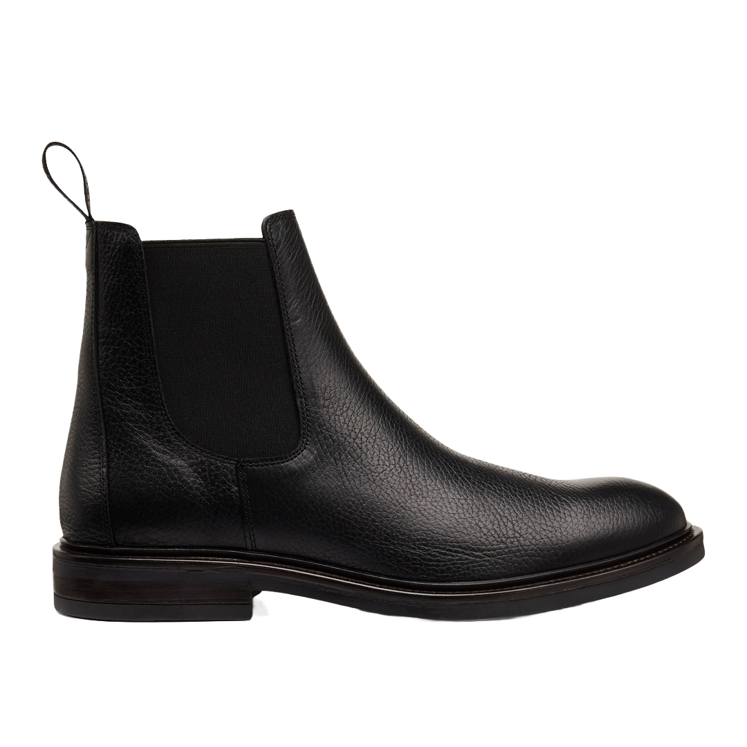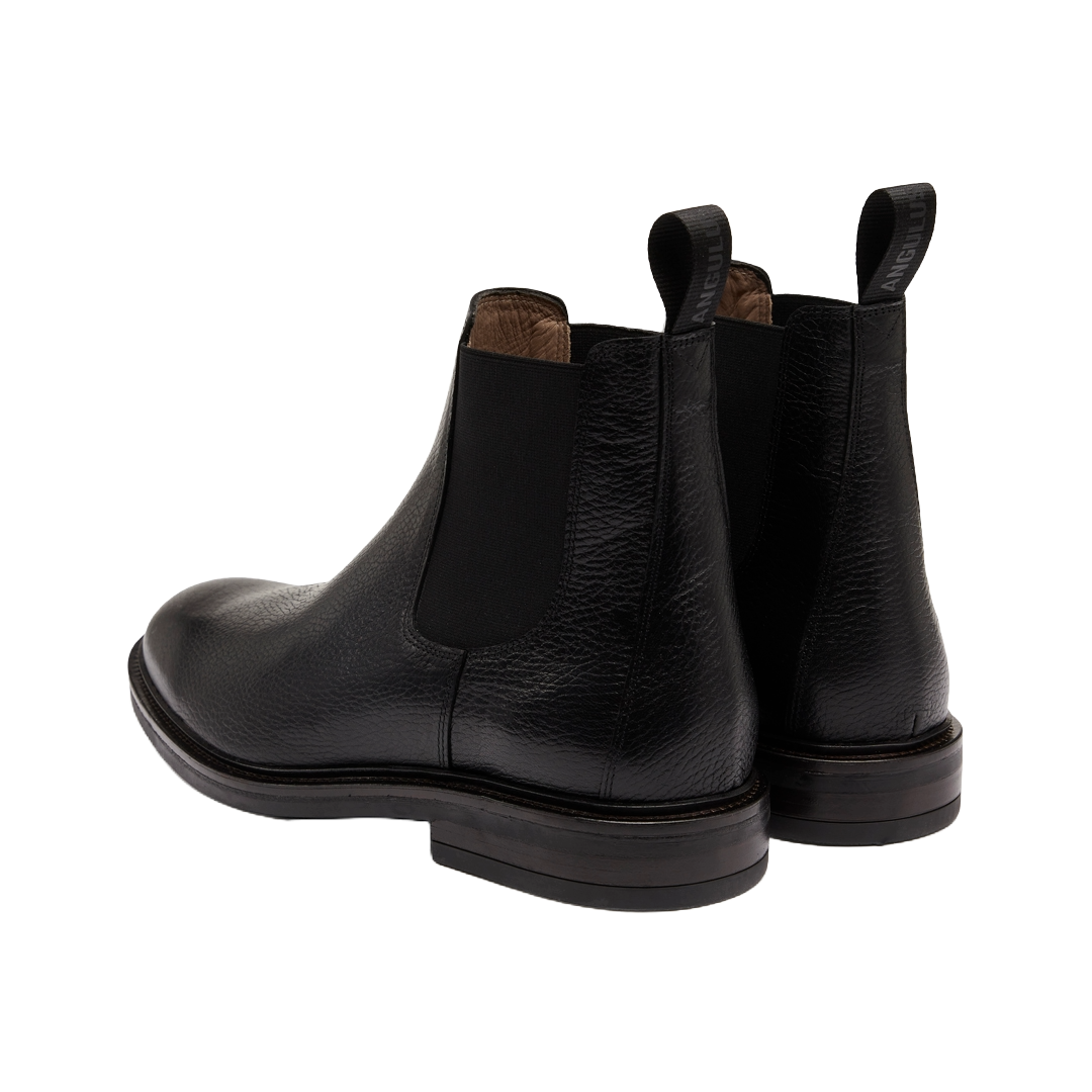 Klassisk Chelsea støvle i skind med logostrop. Støvlen har en rundet snude, funktionelle sorte elastiksider, der gør støvlen nem at få af og på, vatteret indersål, læderfoer og en let og fleksibel tunitsål med rand. Udformet i naturligt og åndbart skind. Designet i Danmark og håndlavet med kærlighed i Portugal.