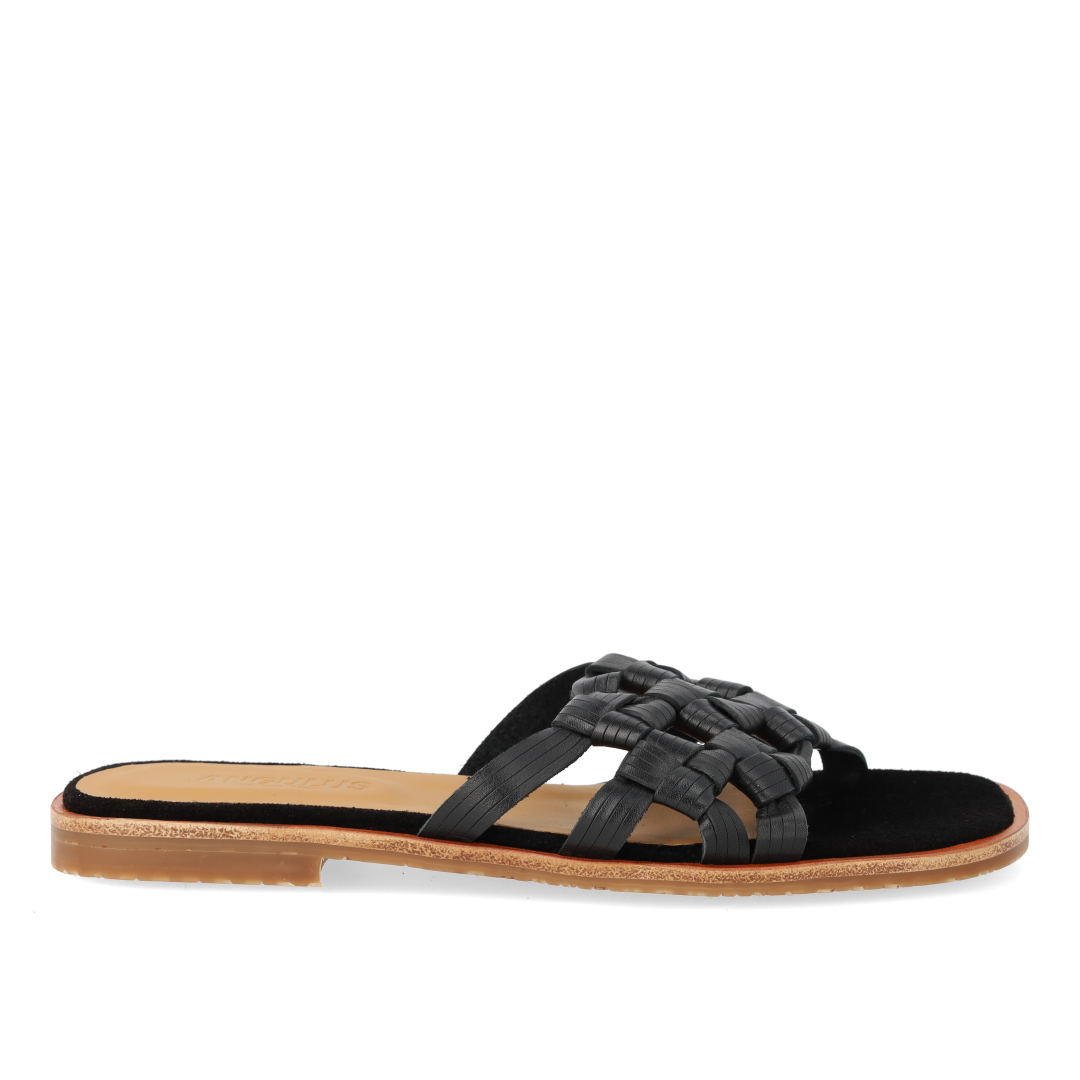 Enkel slip-on sandal med forstykke i flettet læder. Sandalen har en rundet snude, vatteret indersål i kromfrit læder med blød ruskindskant og en let, blød og fleksibel ANGULUS logo gummisål. Udformet i naturligt og åndbart skind. Designet i Danmark og håndlavet med kærlighed i Portugal. Kan indeholde krom.