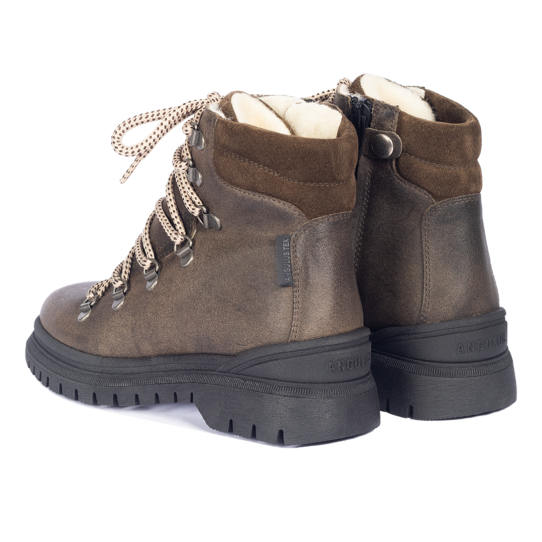 TEX-snørestøvle i split coupe, der er slidstærk og designet til at holde fødder varme og tørre, uanset vejret. Støvlen har en rund snude, tofarvede nylon snørebånd, lynlåslukning og trykknap i den ene side, vatteret indersål, kromfrit læderfoer, vatteret ruskindsdetalje ved skaftets top for ekstra støtte og komfort og en blød og fleksibel gummisål. Støvlen har en chunky ANGULUS sål med ekstra stabil hæl. Udformet i naturligt og åndbart skind med PFAS-fri TEX-membran. Designet i Danmark og håndlavet med kærlighed i Portugal. Mål altid barnets fod inden du køber, så du får købt den rigtige størrelse. Vi anbefaler et voksetillæg på 1-1,5 cm.