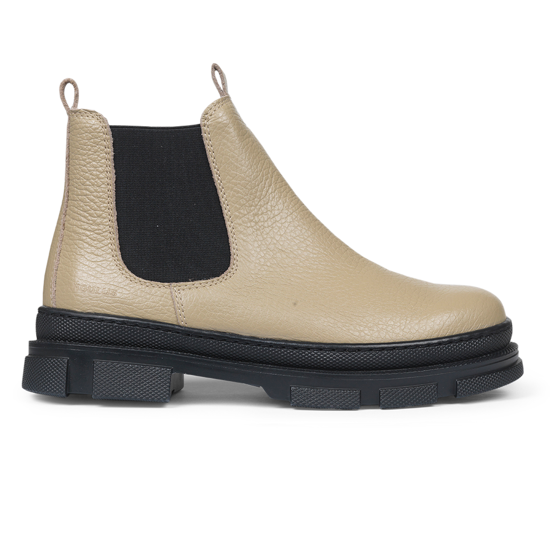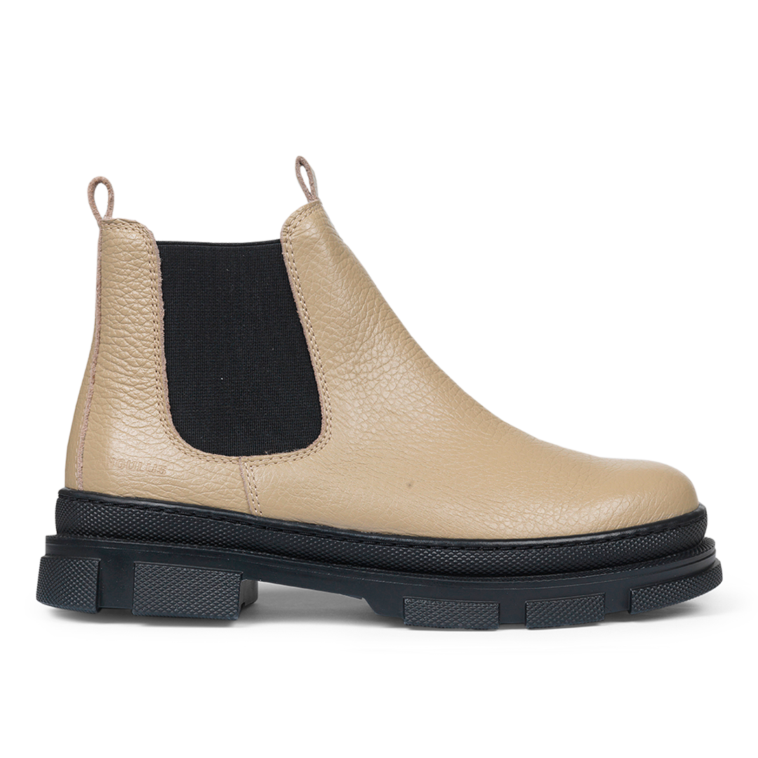 Chunky Chelsea støvle i læder med blød og fleksibel, sort gummisål med track mønster. Støvlen har en rund snude, et lavt skaft med remme og funktionelle elastiksider, der gør støvlen nem at få af og på, vatteret indersål og kromfrit læderfoer. Udformet i naturligt og åndbart læder. Designet i Danmark og håndlavet med kærlighed i Portugal. Mål altid barnets fod inden du køber, så du får købt den rigtige størrelse. Vi anbefaler et voksetillæg på 1-1,5 cm.