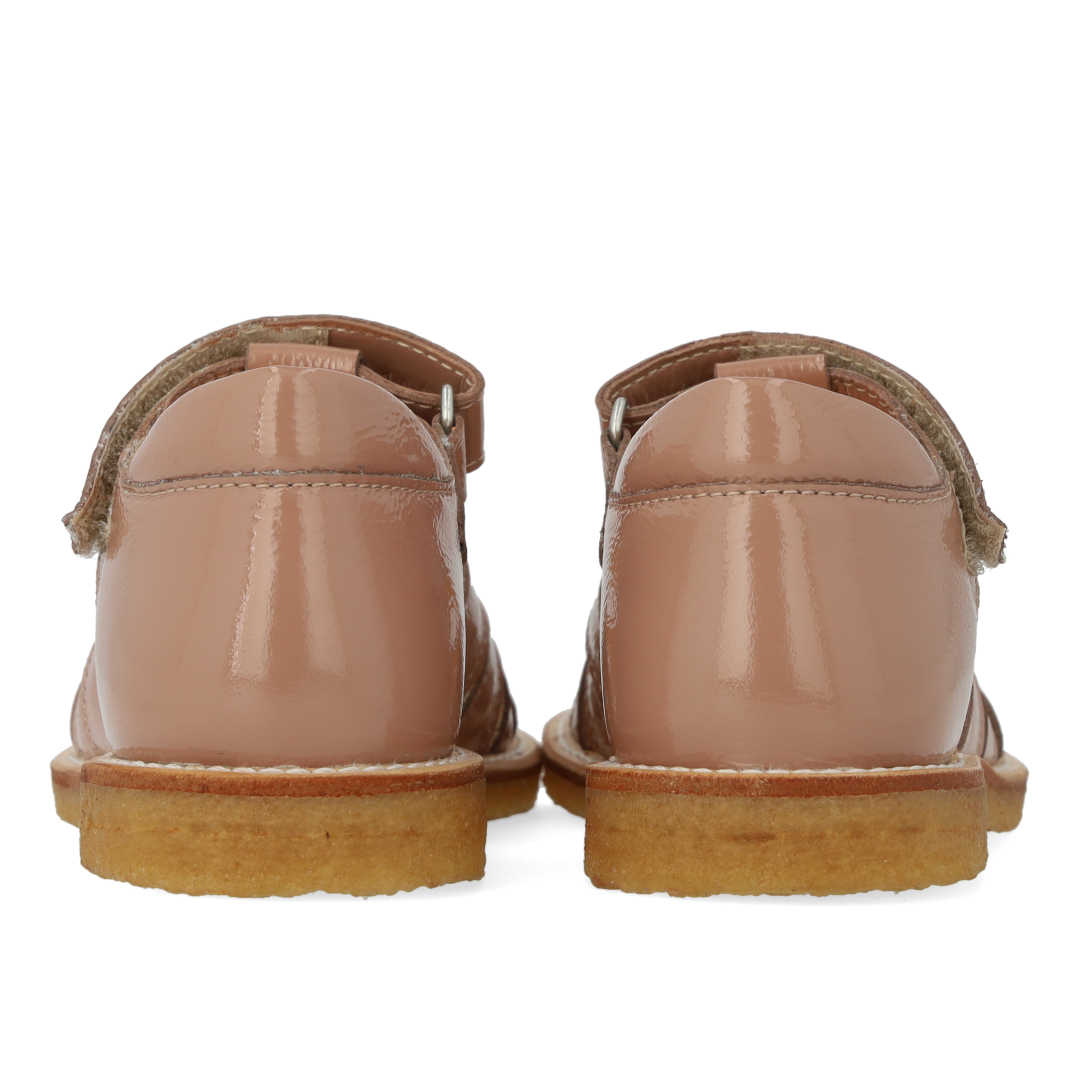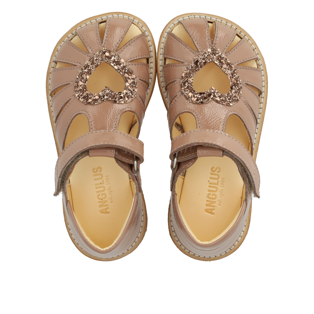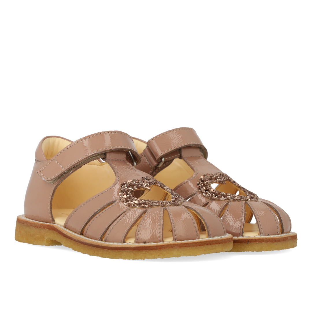 Klassisk hjertesandal med rummelig pasform og funklende glitter hjerte. Sandalen har justerbar velcrorem, lukket tå, vatteret indersål, kromfrit læderfoer, en fast hælkappe med præget logo og polstret krave for ekstra komfort og støtte og en let, blød og fleksibel rågummisål i fornybart naturgummi udskåret med fokus på svangstøtte. Udformet i naturligt og åndbart læder med kanvasbaseret glitter. Designet i Danmark og håndlavet med kærlighed i Portugal. Mål altid barnets fod inden du køber, så du får købt den rigtige størrelse. Vi anbefaler et voksetillæg på 1 cm.