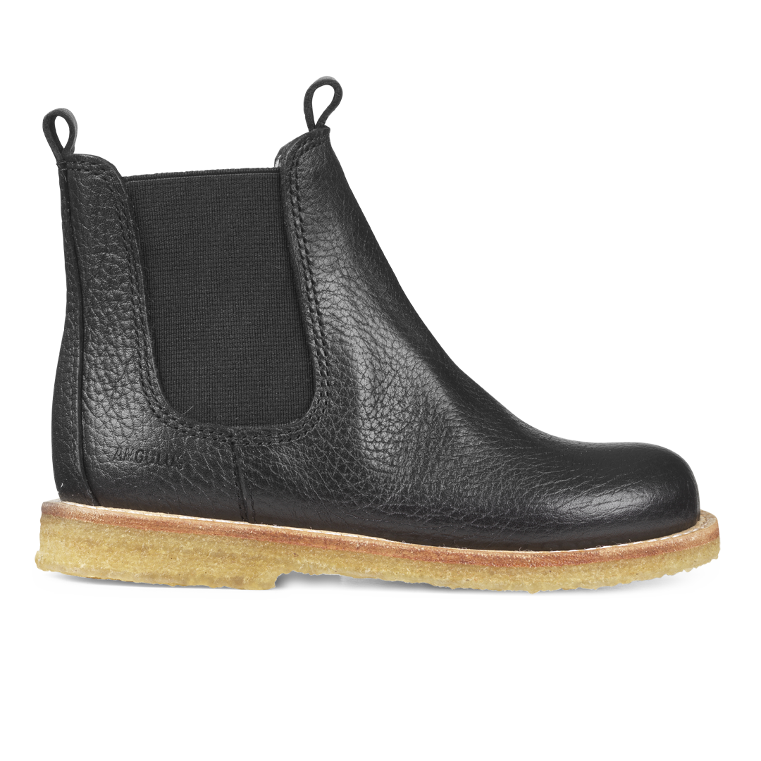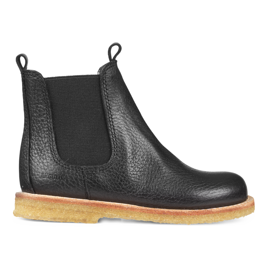 Klassisk Chelsea støvle i læder. Støvlen har funktionelle elastiske sidestykker, mellemhøjt skaft med læderremme, præget logo, en let, blød og fleksibel rågummisål i fornybar naturgummi, vatteret indersål, kromfrit læderfoer og en fast hælkappe for ekstra komfort og støtte. Udformet i naturlig og åndbar skind. Designet i Danmark og håndlavet med kærlighed i Portugal. Mål altid barnets fod inden du køber, så du får købt den rigtige størrelse. Vi anbefaler et voksetillæg på 1-1,2 cm.