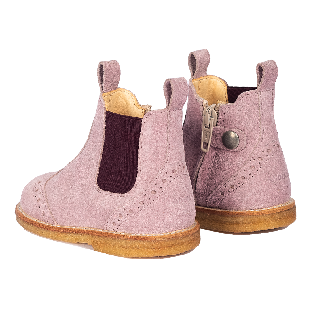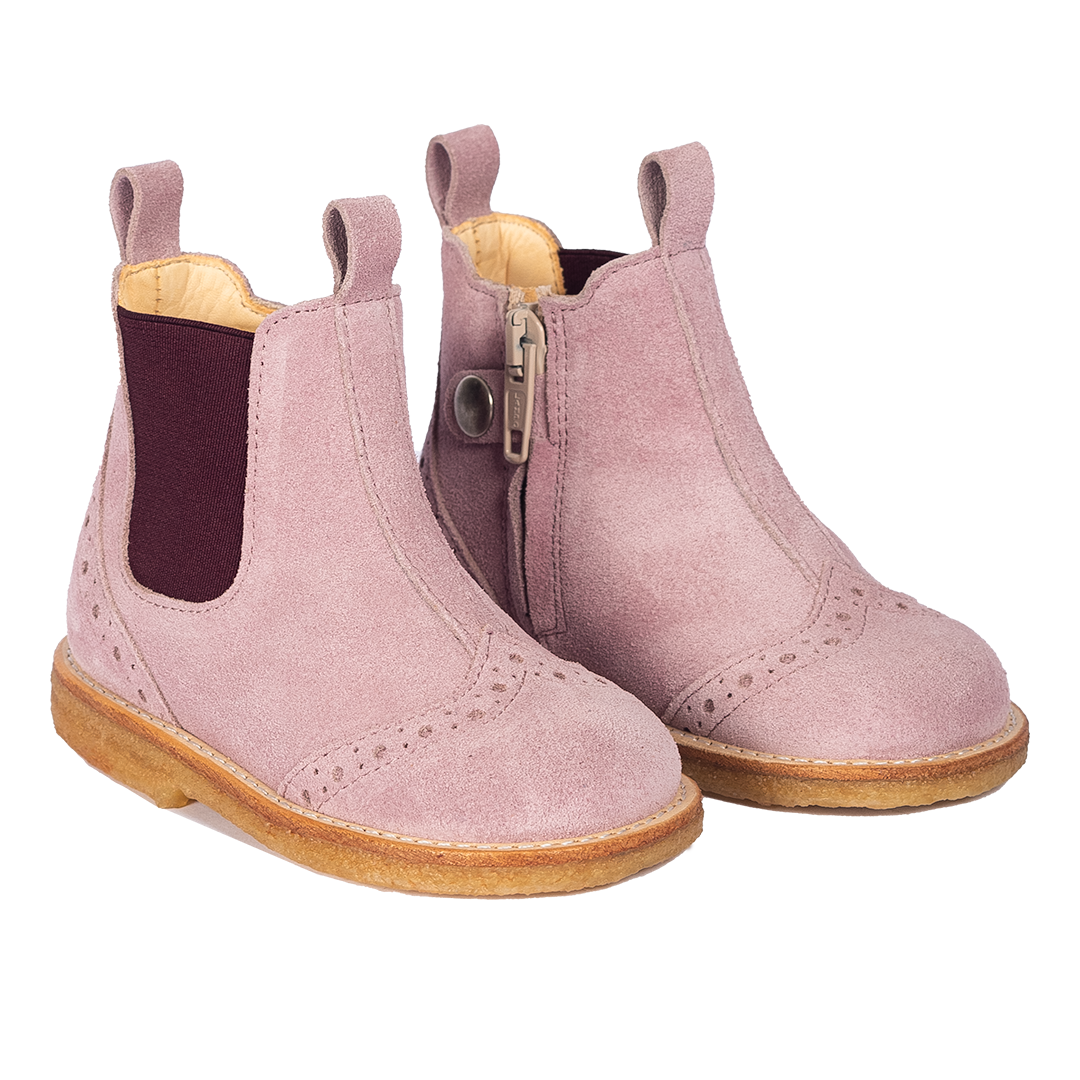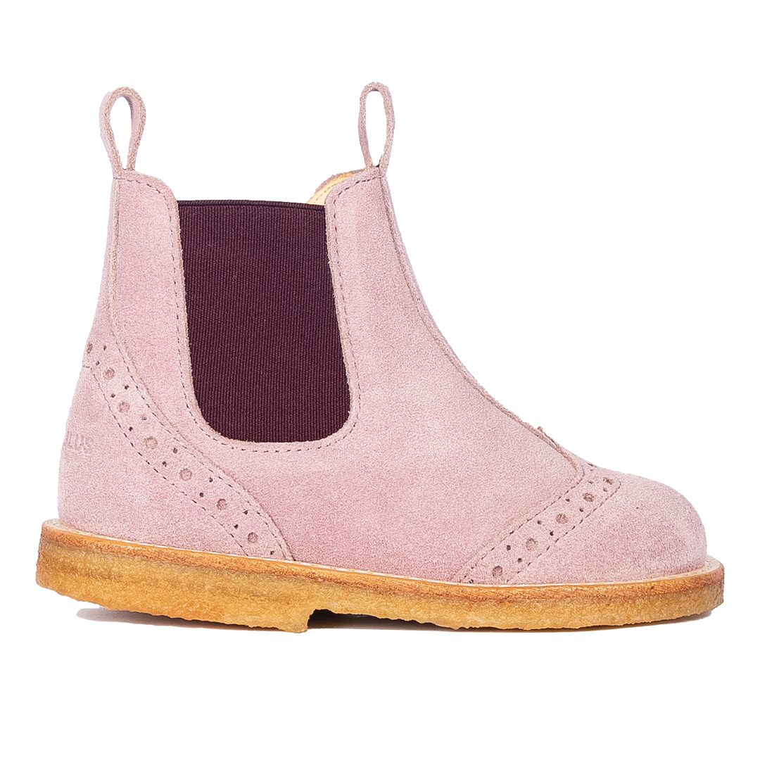 Klassisk Chelsea støvle i blød ruskind med dekorativt brogue mønster. Støvlen har en rund snude, elastik i den ene side og lynlås samt trykknap i den anden, præget logo ved hælparti, let, blød og fleksibel rågummisål i fornybar naturgummi, vatteret indersål, kromfrit læderfoer og en fast hælkappe for ekstra støtte. Udformet i naturligt og åndbart skind. Designet i Danmark og håndlavet med kærlighed i Portugal. Mål altid barnets fod inden du køber, så du får købt den rigtige størrelse. Vi anbefaler et voksetillæg på 1 cm.