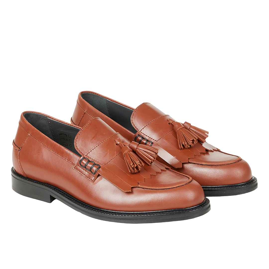 Chunky Penny loafer med kvaster og let sort tunitsål med dekorativ rand. Skoen har en mandelformet snude, polstret indersål og er udformet i naturligt og åndbart skind. Designet i Danmark og håndlavet med kærlighed i Portugal.