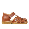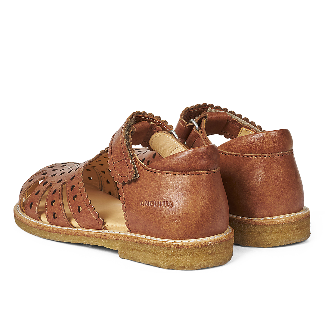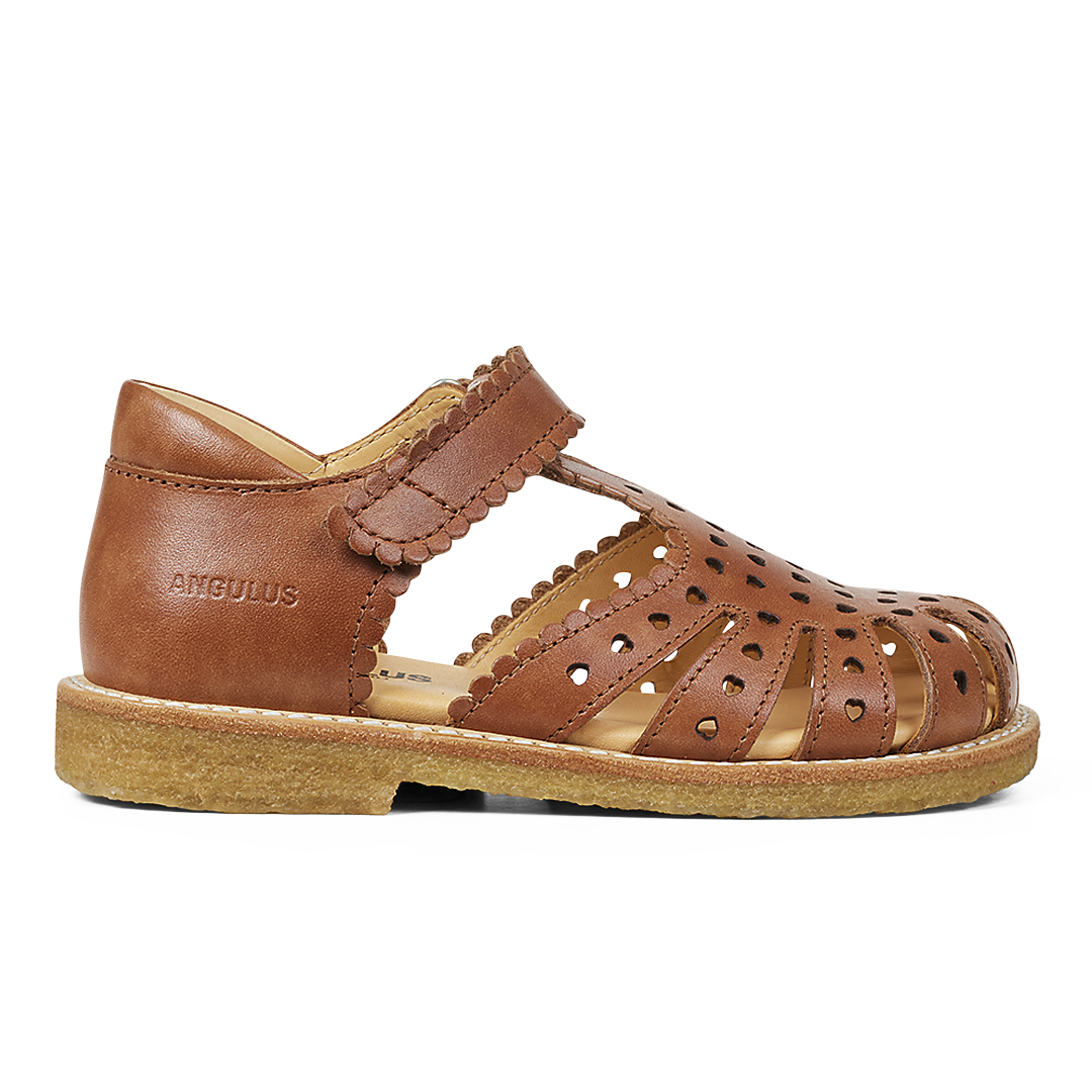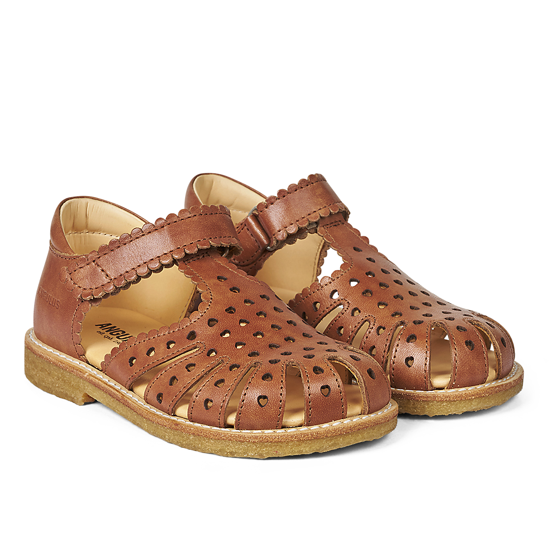 Lædersandal med udstanset hjertemønster og dekorative bølgekanter. Sandalen har en justerbar velcrorem, lukket tå, præget logo ved hælen, vatteret indersål, kromfrit læderfoer, fast hælkappe med vatteret krave for ekstra komfort og støtte og en let, blød og fleksibel rågummisål i fornybart naturgummi udskåret med fokus på svangstøtte. Udformet i naturligt og åndbart læder. Designet i Danmark og håndlavet med kærlighed i Portugal. Mål altid barnets fod inden du køber, så du får købt den rigtige størrelse. Vi anbefaler et voksetillæg på 1 cm.