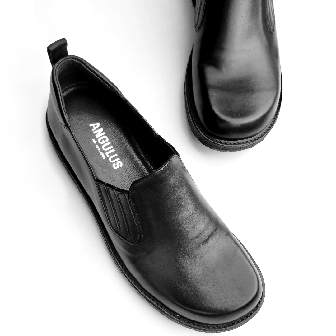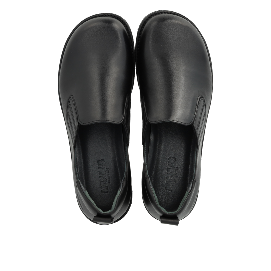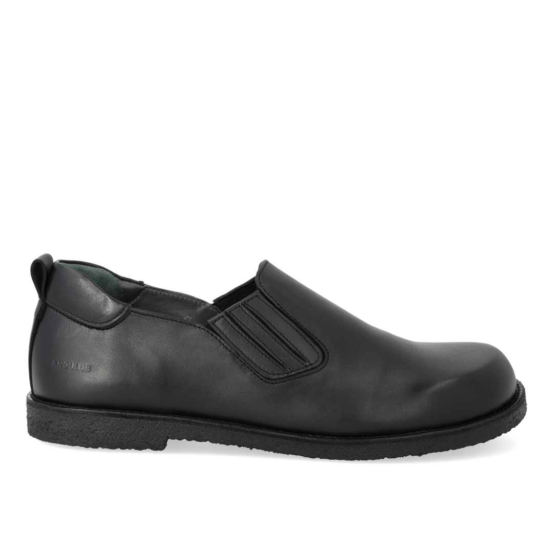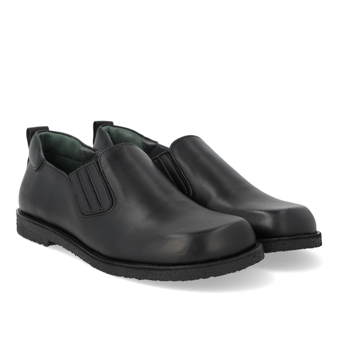 Enkel lædersko med rummelig pasform. Skoen har en rundet snude, funktionel elastik ved instep, præget logo ved hælen, polstret krave for ekstra komfort og støtte, vatteret indersål, læderfoer og en let, blød og fleksibel sort rågummisål i fornybar naturgummi. Udformet i naturligt og åndbart skind. Designet i Danmark og håndlavet med kærlighed i Portugal.