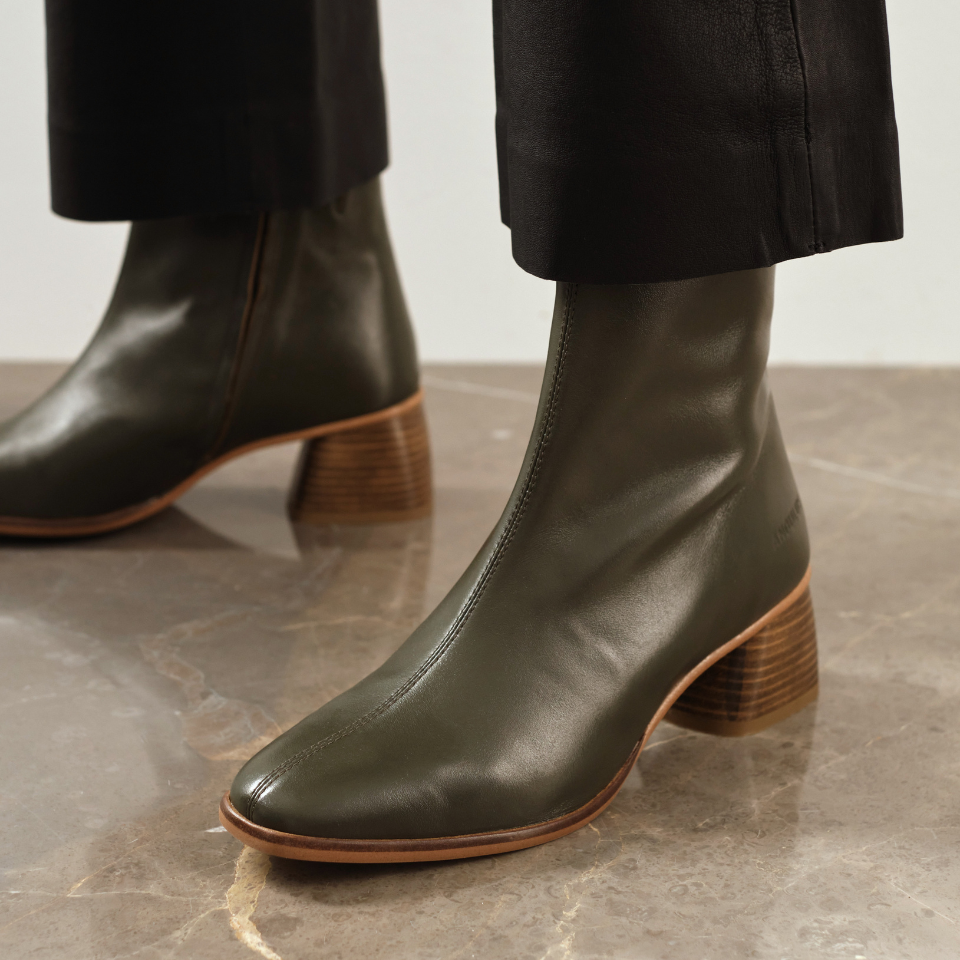 Minimalistisk støvle med skulpturel træhæl. Støvlen har en polstret læder indersål og en let tunitsål med 5 cm hæl. Udformet i naturligt og åndbart skind. Designet i Danmark og håndlavet med kærlighed i Portugal.