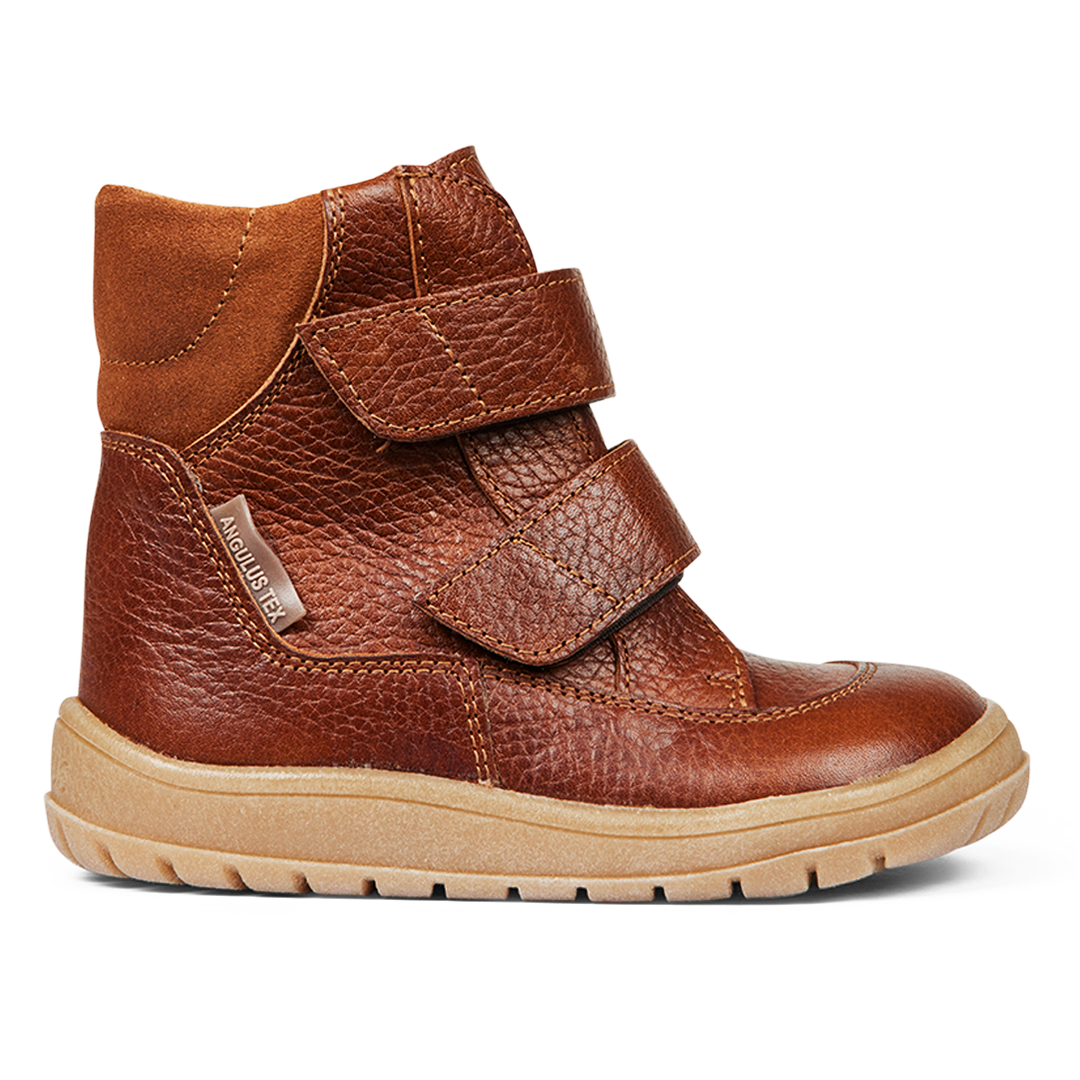 Klassisk, vandafvisende TEX-støvle i læder med rummelig pasform. Støvlen har justerbare velcroremme, åndbart uldfoer, en let, blød og fleksibel ANGULUS gummisål med logo ved hælen og en fast hælkappe med vatteret krave for ekstra komfort og støtte. Udformet i naturligt og åndbart skind med PFAS-fri TEX-membran. Designet i Danmark og håndlavet med kærlighed i Portugal. Mål altid barnets fod inden du køber, så du får købt den rigtige størrelse. Vi anbefaler et voksetillæg på 1-1,5 cm.